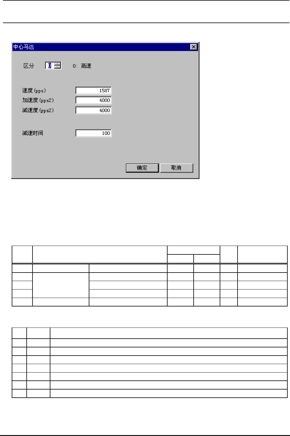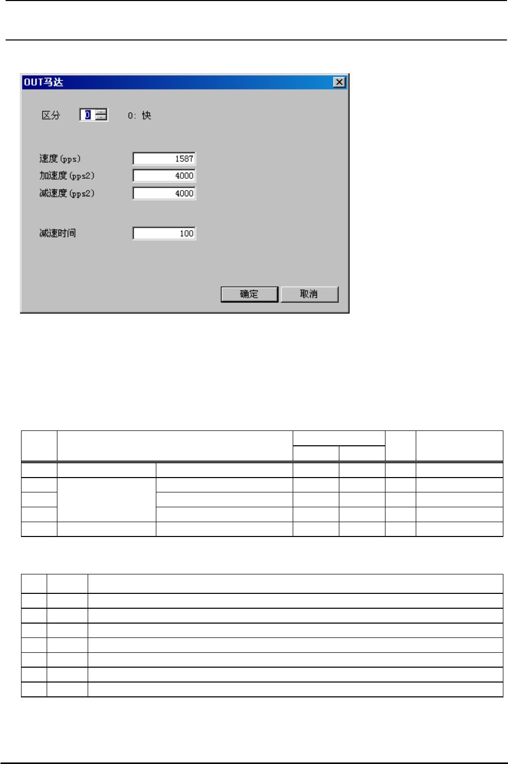 R e v 1 . 00c 机械控制参数 4-43 4-3-5 OUT 马达 图 4-3-5 OUT 马达 (1) 设定画面的显示方法 菜单∶ [ 输入 ]→[ 传送 ]→[OUT 马达 ] 起动∶ [ 传送 ] 按键 →[OUT 马达 ] 按键 (2) 设定项目 输入范围 № 项目 最小值 最大值 单 位 备考 1 区分 0 9 参照 (3) 区分 2 速度 (pps) pps 3 加速度 (pps2) pps 2 4 OUT 马达 …