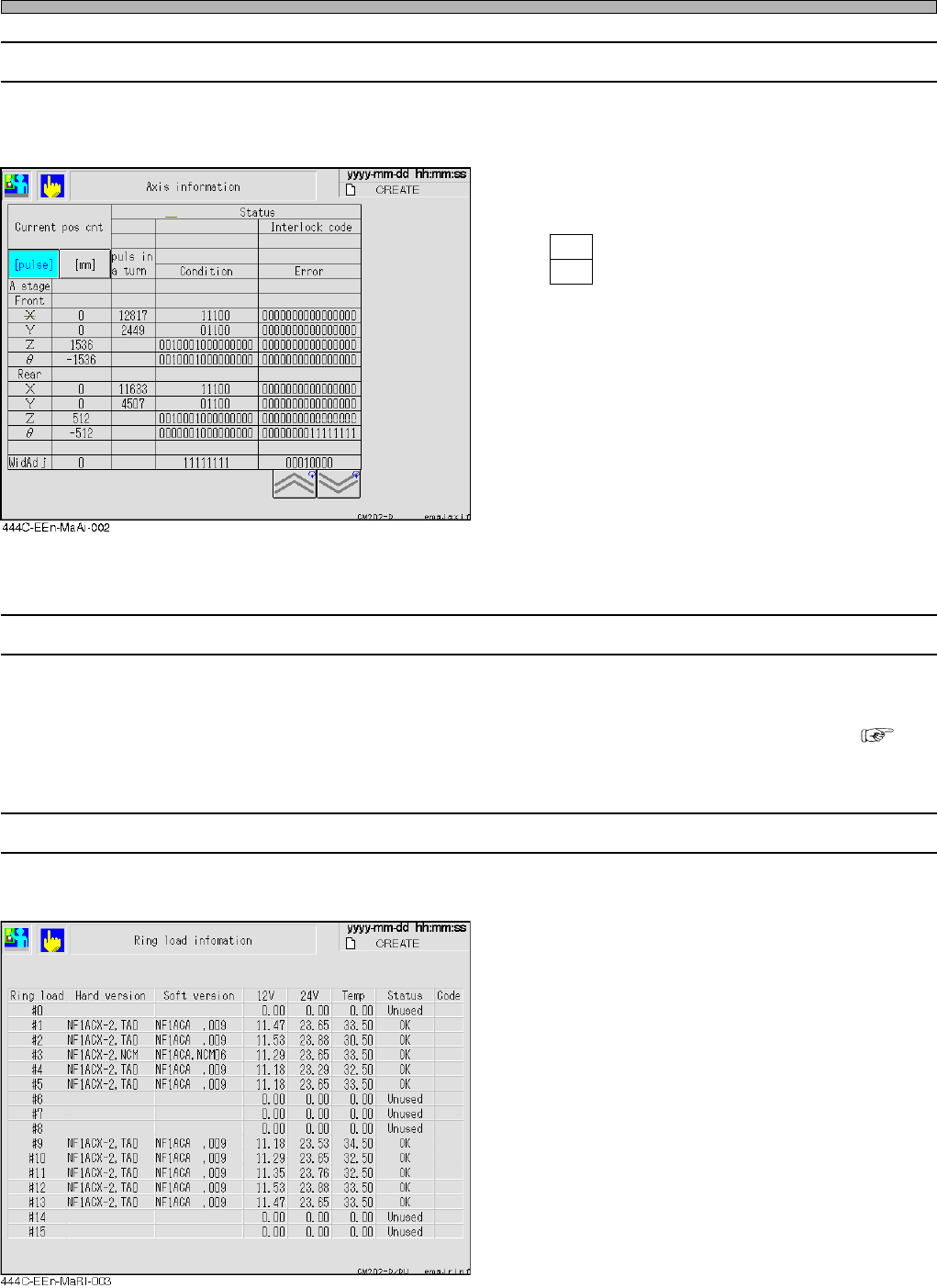 Page 3-22 Machine Adjustment 3-4-8 Axis Information This is used to check the current positions of all the axes the machine controls and the status information. Current pos cnt Displays the current position of each axis …