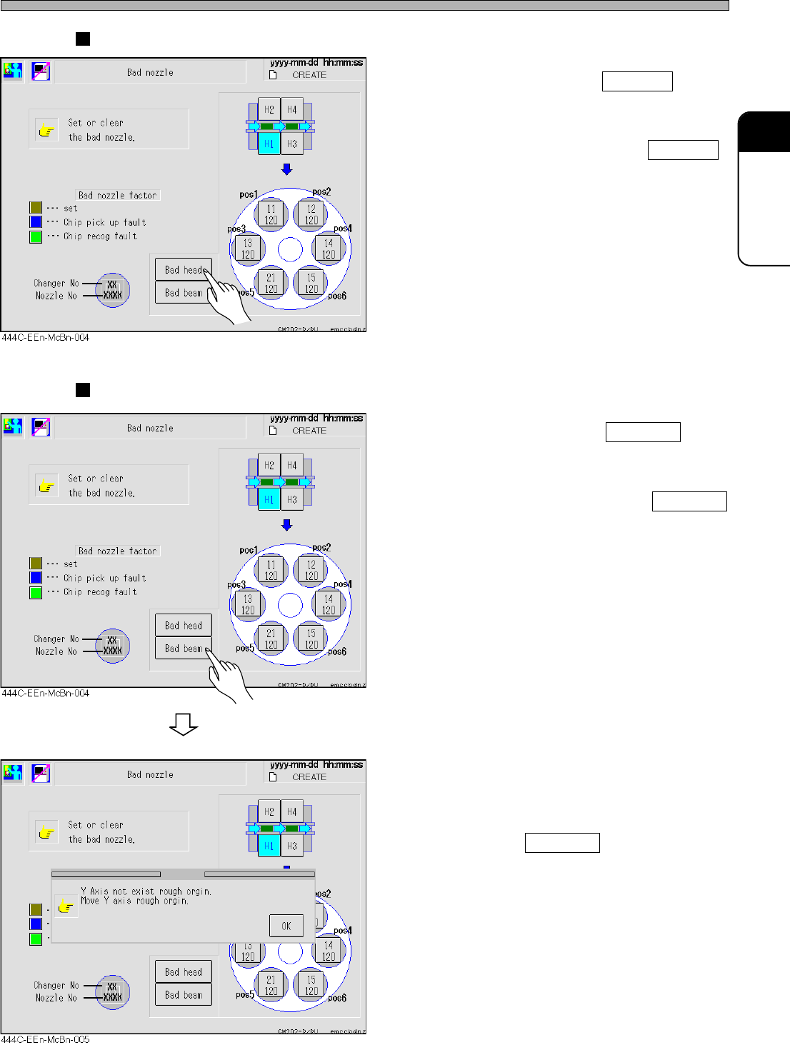 Page 3-25 FUNCTIONS 3 Machine Settings Setting/Canceling Bad Head • T o set the bad head, press Bad head . When the bad head is set, the button is high- lighted in yellow . • T o cancel the bad head, press the Bad head h…
