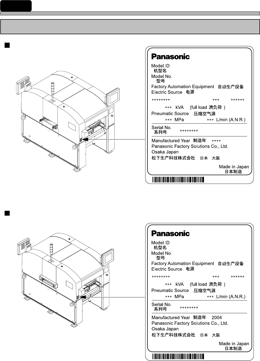 The serial plate attached to this machine indicates the model name and production number.