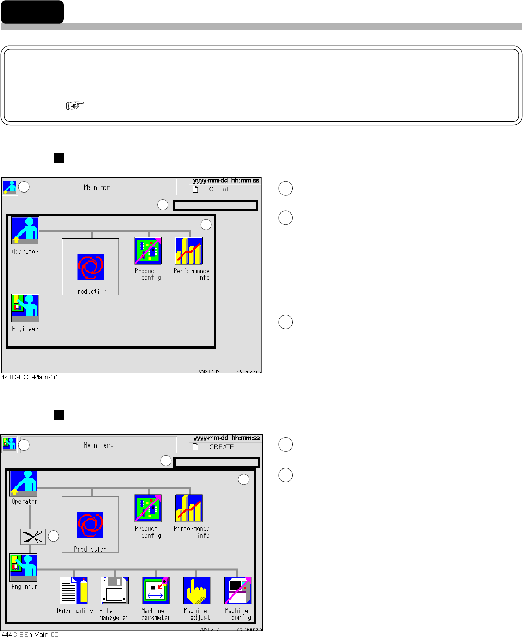 Page 2-10 444C-E-OMA02-A01-02 2-3 Main Menu NOTICE On this equipment, you are free to change the menu configuration of the operator mode. ( 3-5-5 Customizing Operator Mode ) Screen of operator mode 1 This icon shows an o…