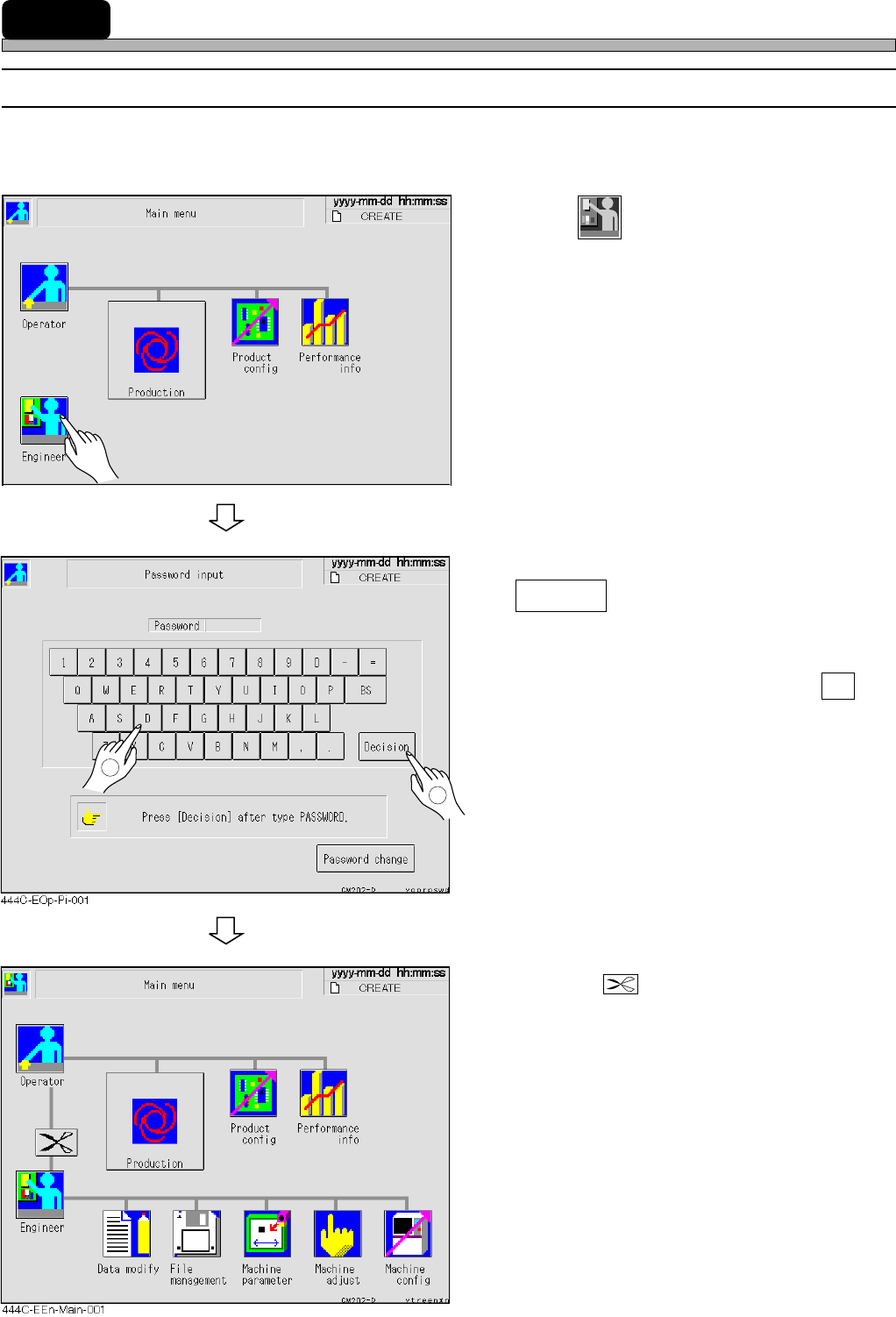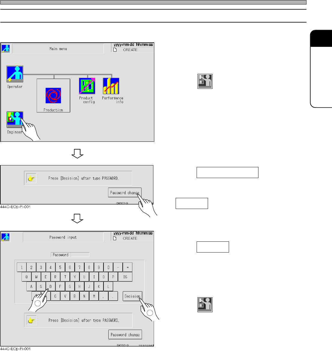 Page 2-13 BASIC OPERA TION 2 444C-E-OMA02-A01-01 Engineer Mode 2-4-2 How to Change Password ∗ T o change (set) the password, you need the key floppy disk for changing password. 1 . Insert the key floppy disk for chang- i…
