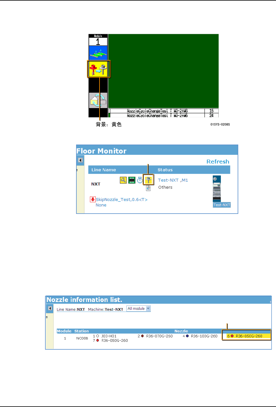 QD142-14 4. 生产 NXT II 系统手册 201 此时, 操作画面的状态区域的示意图的背景变成黄 色, 告知操作者吸嘴置放台 内有需要维修 保养的吸嘴。 在辅助软件的在线监视器上,吸 嘴图标的背景色也同时变成黄色 。 如果吸嘴置放台内还有预备吸嘴 ,机器会 继续生产。 更换吸嘴时, 请按照以下的步骤进行。 吸嘴的准备 首先,请准备必要的吸嘴,缩短 吸嘴更换时的机器的停止时间。 1. 请点击在线监视器的吸嘴图标。 2. 在 N…