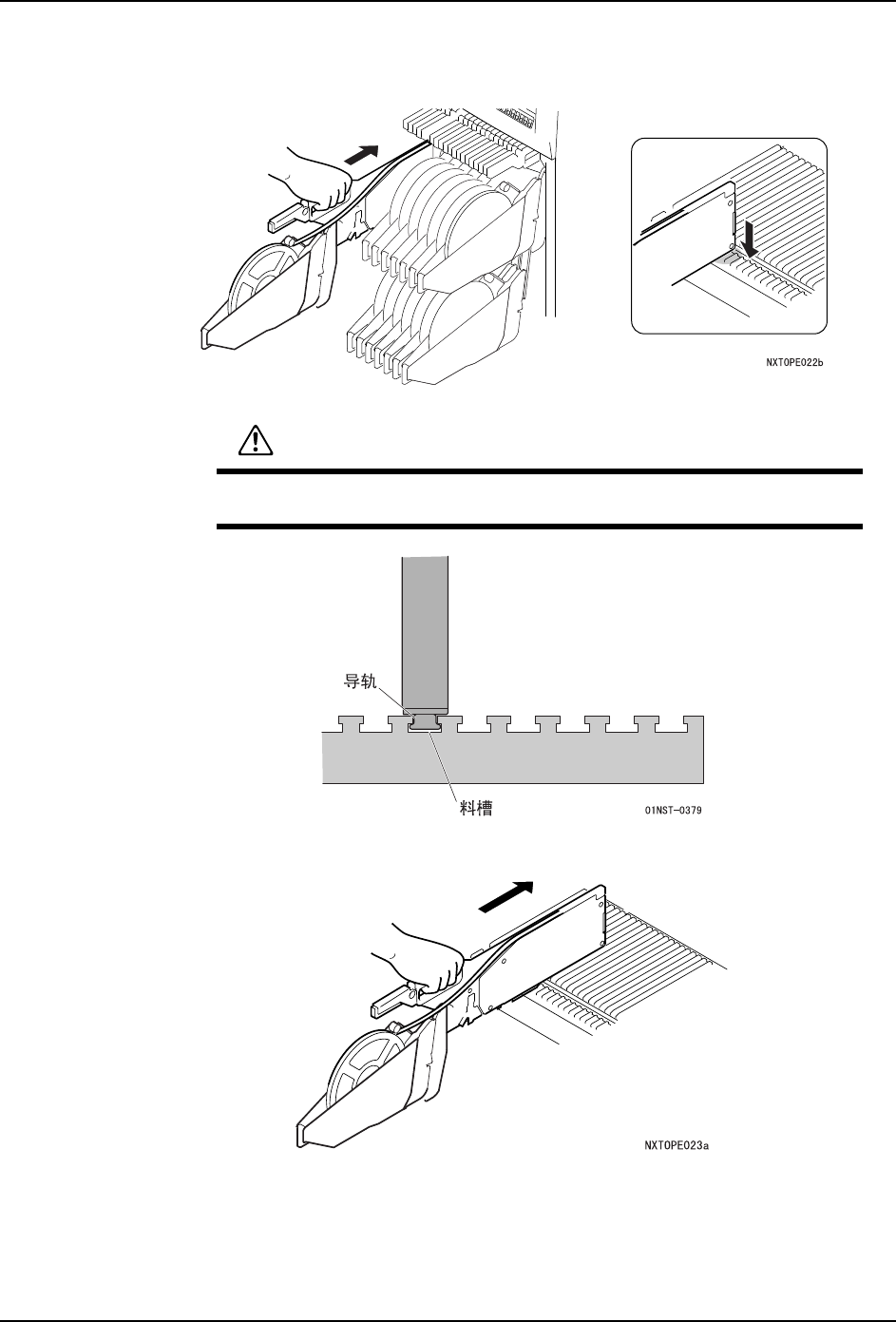 请将供料器底部的导轨准确地插入到料槽内。如果没有正确地安装,供料