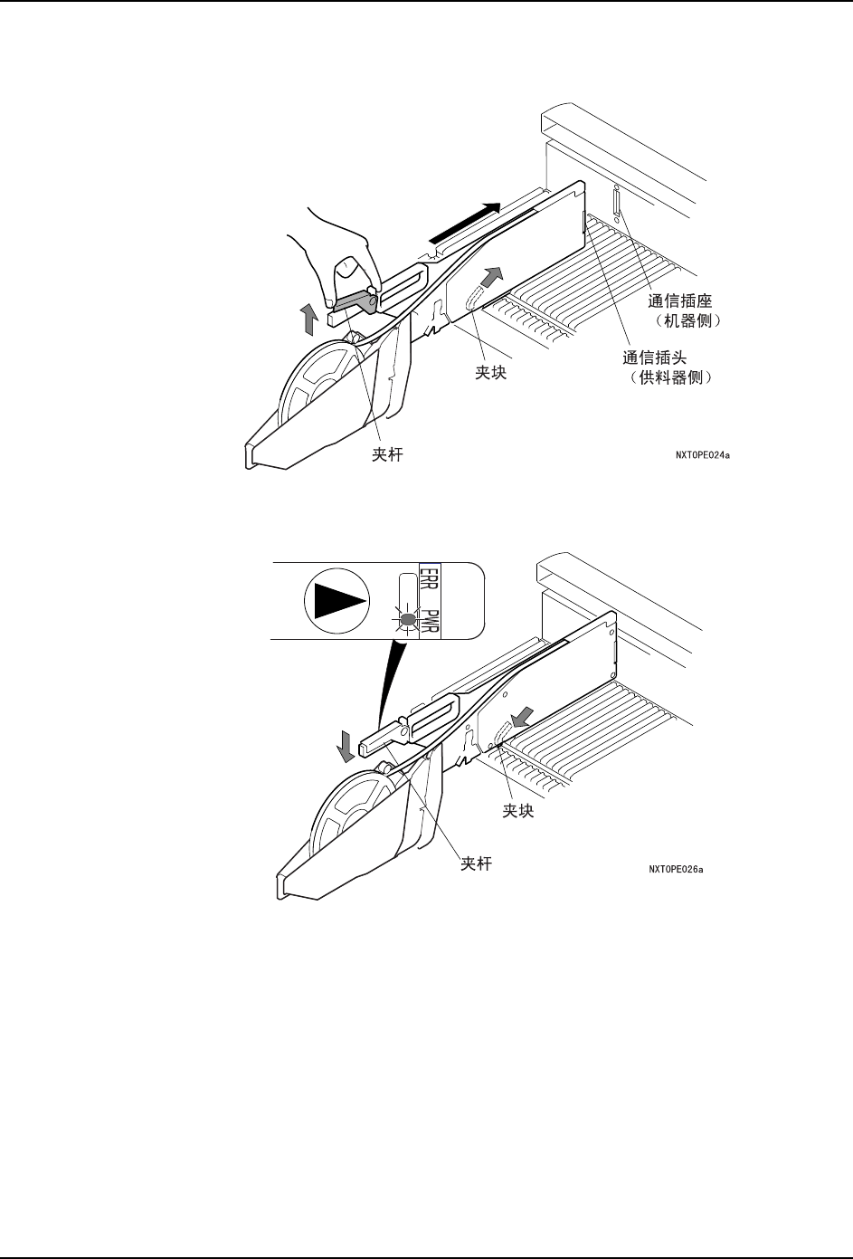 6. 提起供料器的夹杆后,夹块被提起。在这种状态下,用力将供料器前端的通信插头插入