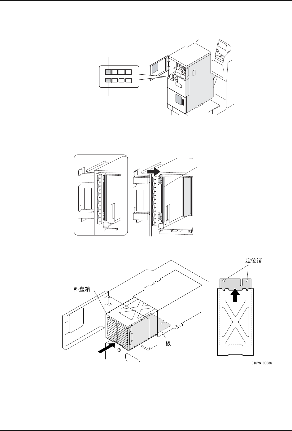 b. 将料盘箱放置在板上,然后挪到后方。通过定位销,料盘箱被安装在所定的位置上。