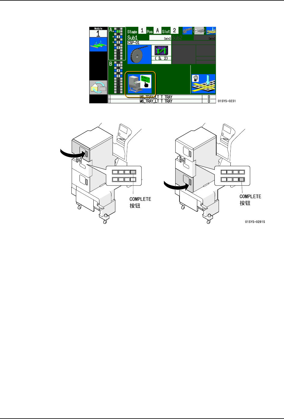 6. 请关闭正面门,按下 COMPLETE 按钮。更换另一个料盘箱时,请重复执行同样的操作。
