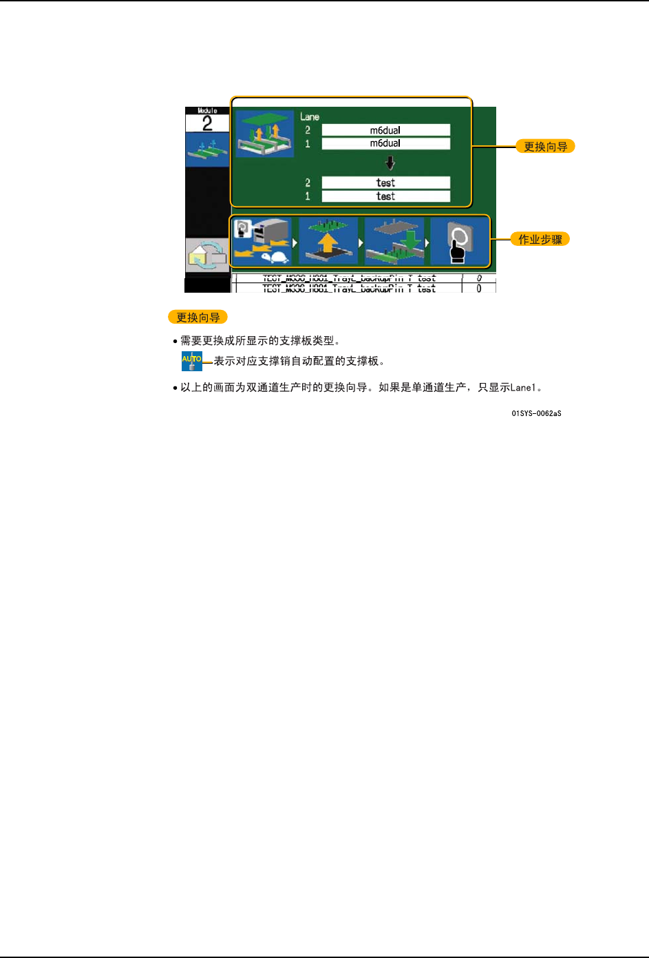 QD142-14 5. 换线 NXT II 系统手册 309 5.11 支撑板的更换 5.11.1 支撑板更换向导画面 备注 )从单搬运轨道切换到双通道生产时 ( 或者相反 ), 或者变更搬运轨道宽度时, 有时需要 进行支撑销的更换。搬运轨道宽度自动地调节到与下工序生产的电路板宽度相吻合。