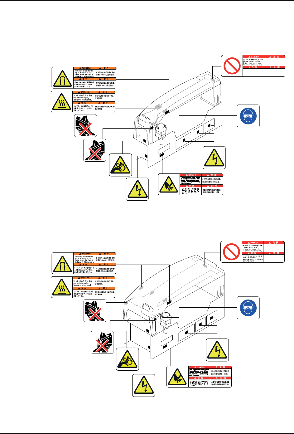 表示使用机器时的注意事项的安全标识贴在机器的下图所示位置。请仔细阅读记载内容,安