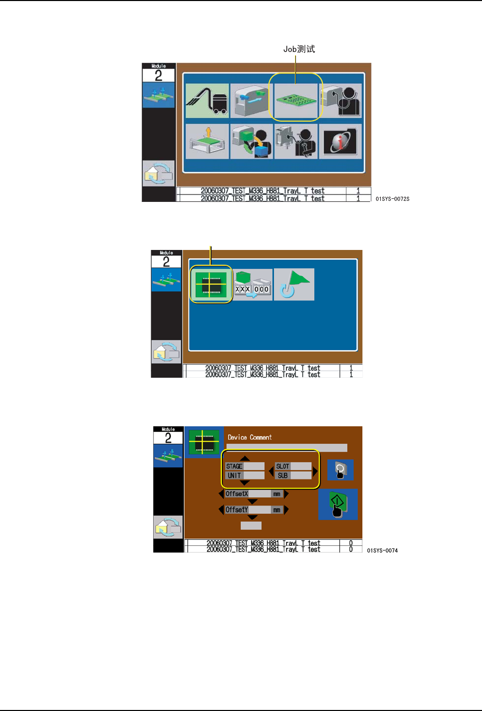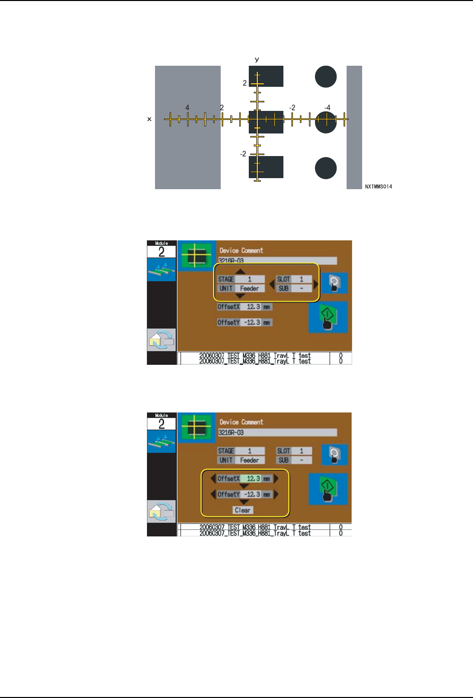 6. 手动模式指令 QD142-14 344 NXT II 系统手册 3. 请使用箭头键选择 Job 测试示意图后按下 OK 按钮。 4. 选择吸取位置确认指令后按下 OK 按钮。 5. 请使用箭头键选择进行吸取位置确认的单 元和料槽 (料盘单元时则为副料槽)。只能够 选择 Job 中指定的料槽。 备注 ) 1.此时, 如果在所选择料槽上的供料器需要进行送料时, 在画面上显示送料次数。 请用 手动使载体料带前进(使显示次数加 1) 。 …