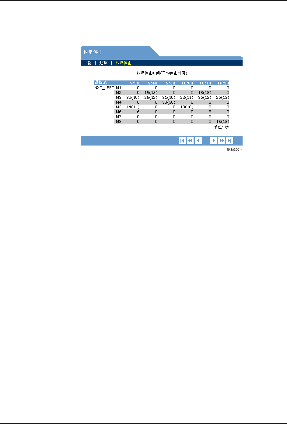 以一览显示不同模组、不同时间区间由于料尽而产生的停止时间。括号内的数字表示料尽停