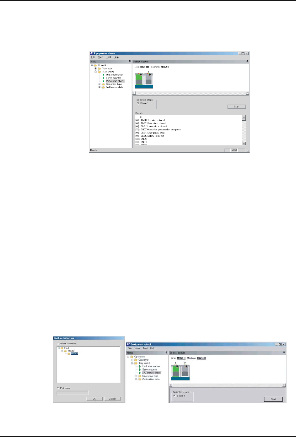 首先,在 [Machine Selection] 内选择对象机器。接着,从 EquipCheck 窗口的 [ 模组选择
