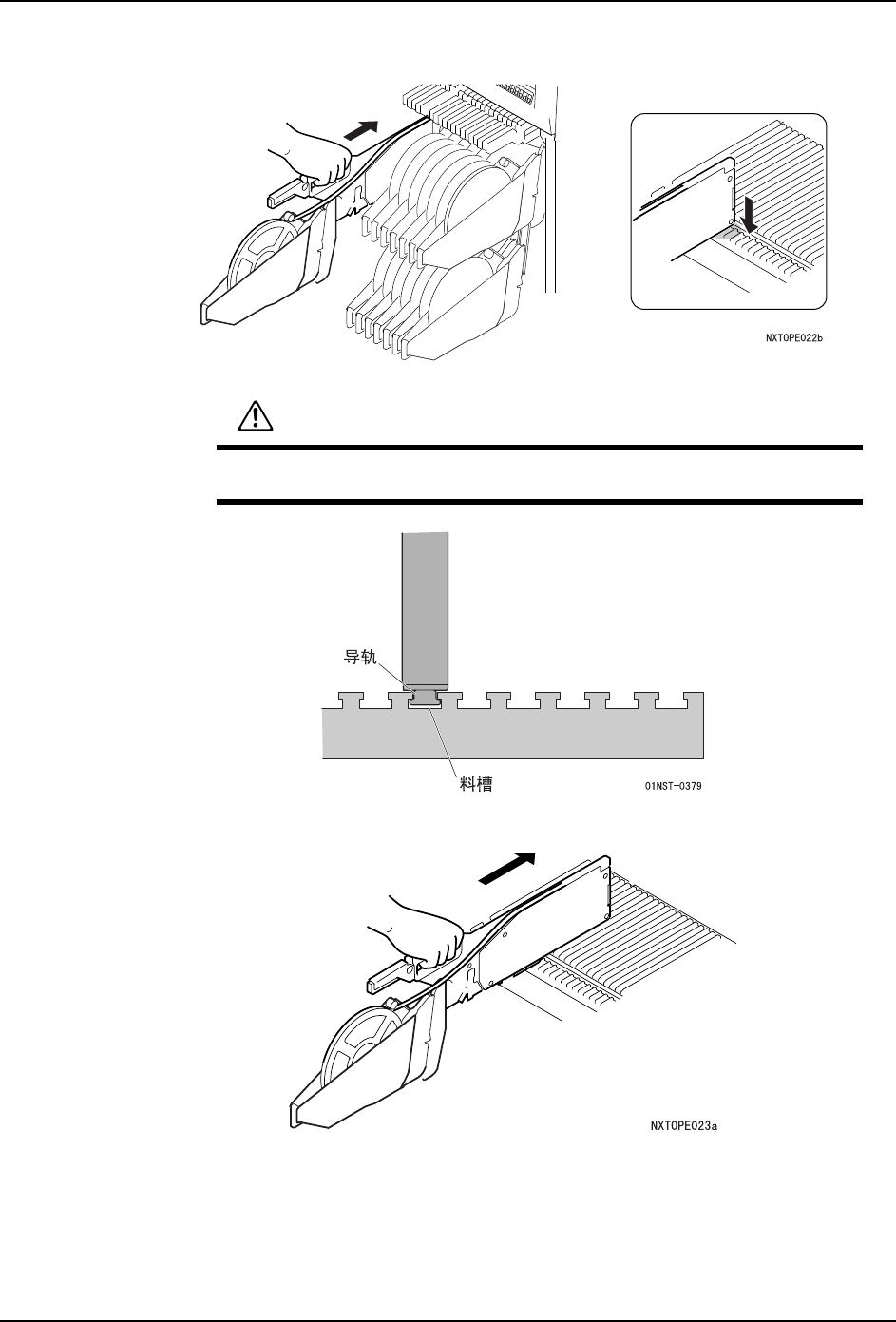 请将供料器底部的导轨准确地插入到料槽内。如果没有正确地安装,供料