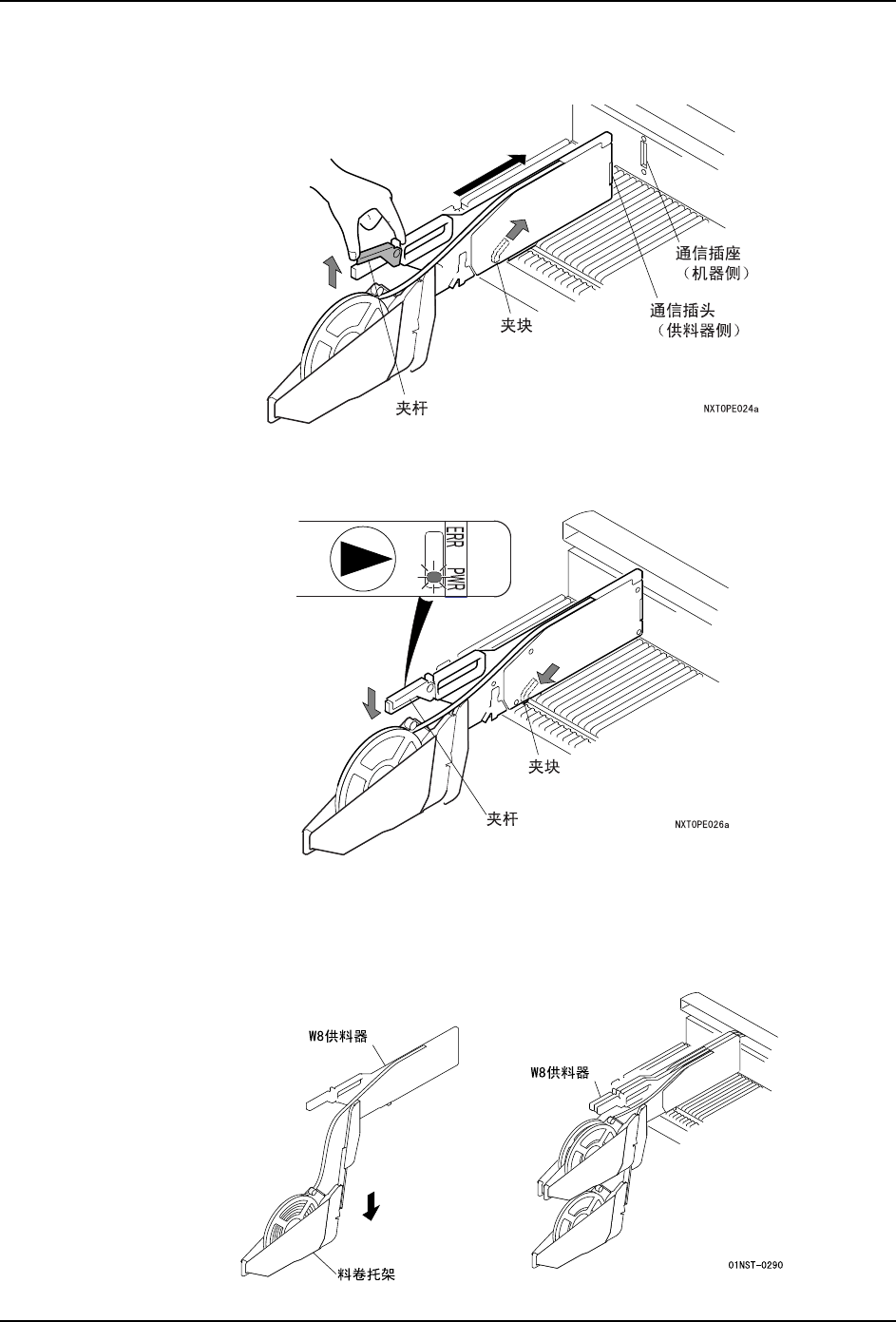 4. 生产 QD142-14 54 NXT II 系统手册 10.提起供 料器的 夹杆后 ,夹块 被提起。在 这种 状态下, 用力 将供料 器前端 的通信 插头 插入 到供料托架一侧的插座中。 11.放下夹杆。供料器被夹块锁定 ,供料器的电源处于 ON。此时 ,请确认供料器的 "PWR" LED 灯亮。 备注 )即使供料器被完全插到最 里面, 但夹块的锁定没有可靠进行时 ,会造成设置 在夹块部 的传感器没有 ON, …