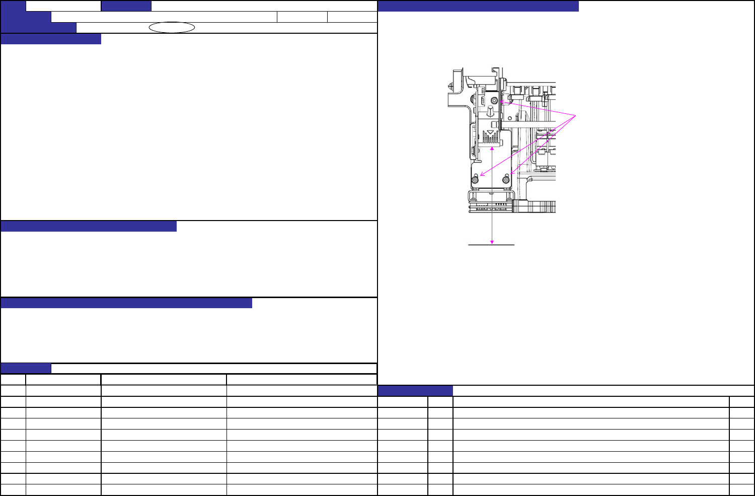 QA表 NO. 13 (1/2) NO. 13 (2/ 2) 机种 调整方法 将L侧的ZA导向滑块(上下)抵住贴装头板组装。 R侧的ZA导向滑块先任其自由。 使用治具插入导轨。 将L侧ZA导向滑块抵住贴装头板组装。 在滑动顺畅的状态下固定R侧的ZA导向滑块。 R侧滑块使用治具组装。 NO ① ② NO. 担当人 ③ ④ ⑤ ⑥ ⑦ ⑧ ⑨ ⑩ 40206650 贴装头板J1 対象部品 品番 品名 関連する品質特性 40194753 LM…