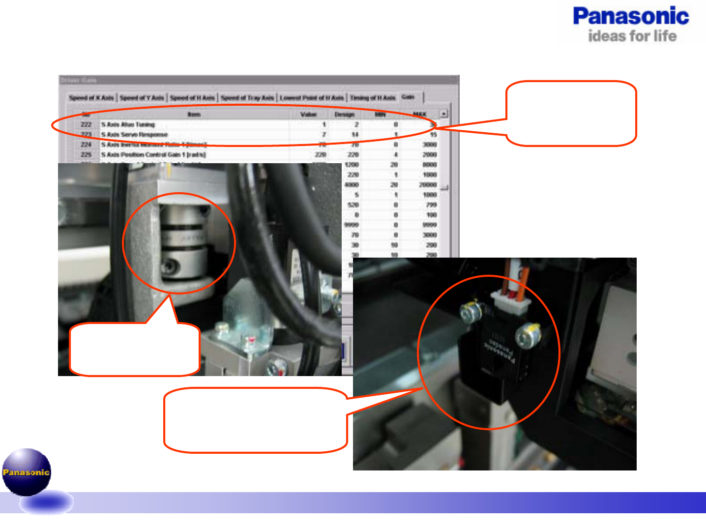 2、将Gain调整到原来的一半(伺服OFF),松开马达的COUPLING