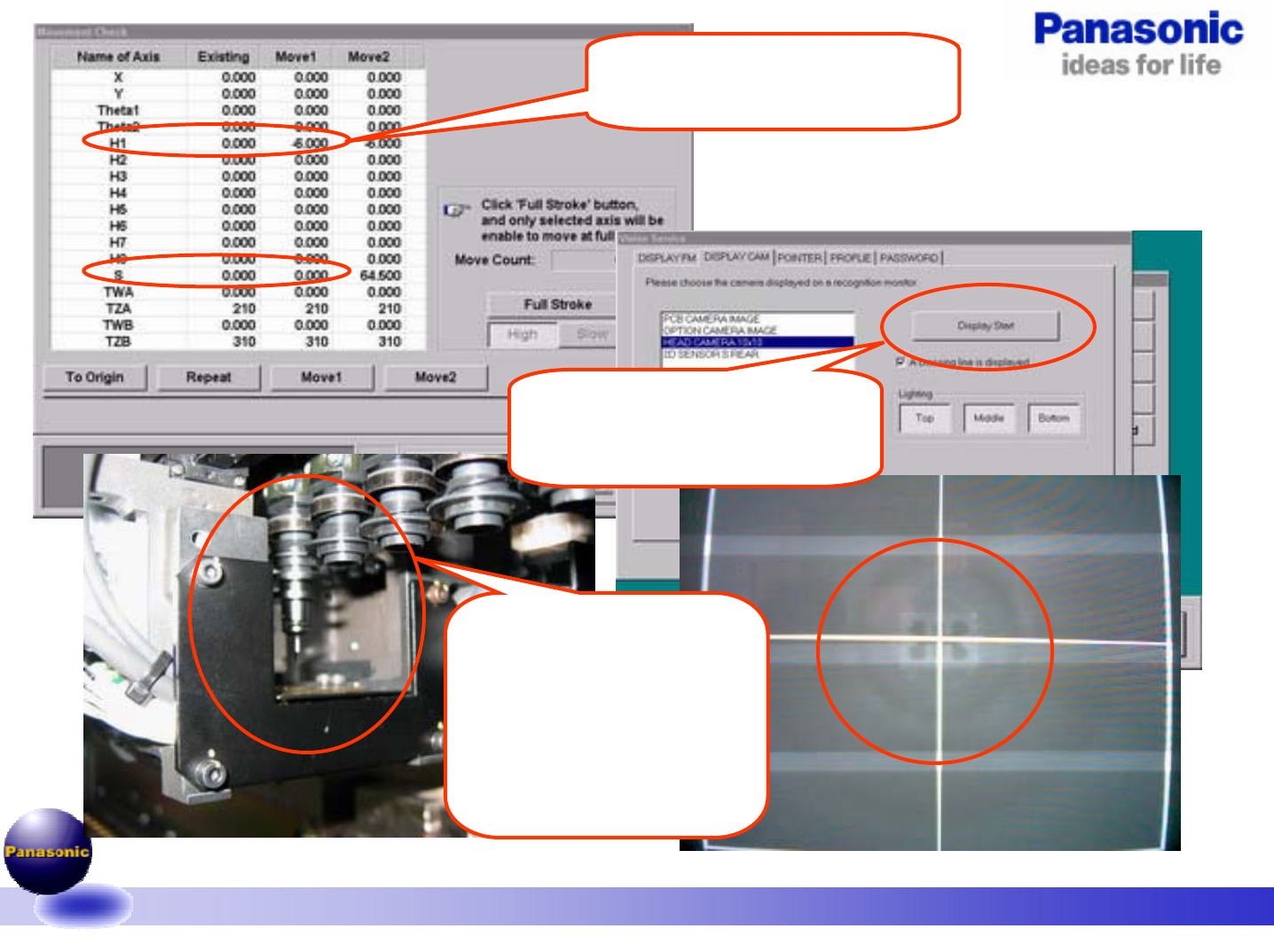 1.1-050805 23/49 NC move 移动 H1 到- 6 后, 移动 S 轴到 64.5 在 Administrator 菜单中 的 Vision Service 中打开 Head Camera 显示 手动调整 S 轴 Camera , 使屏幕上十字线和吸 嘴中心重合,轻锁 后,伺服 OFF 锁紧。改 回 Gain 值后,再次确 认。