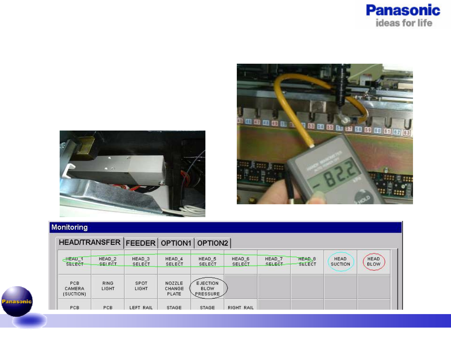 1.1-050805 26/49 十一、真空气压测定。 真空( -80Kpa ) : 1. 将 NOZZLE S 装于测定 HEAD ,进入 MONITOR 画面 2. 选择测定 HEAD ,选择 HEAD SUTION 3. 将 HEAD 下降至 -45mm ,将真空表插入 NOZZLE 4. 记录读数;若不良,更换真空发生器