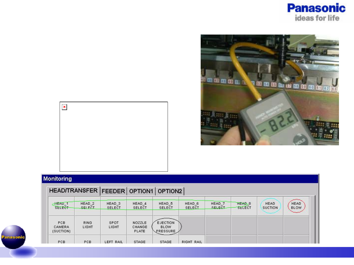 1.1-050805 28/49 十三、抛料的气压测定。 抛料( 25~30Kpa ) : 1. 将 NOZZLE S 装于测定 HEAD ,进入 MONITOR 画面 2. 选择测定 HEAD ,同时选择 HEAD BLOW 和 EJECTION BLOW PRESSURE 3. 将 HEAD 下降至 -58mm ,将真空表插入 NOZZLE 4. 记录读数;若不良,调节气压调节阀