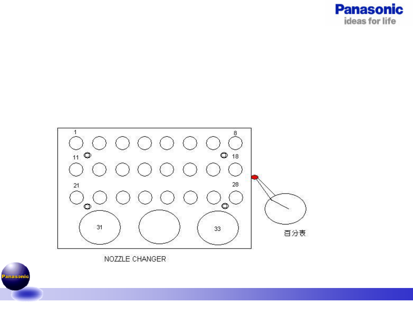 1.1-050805 30/49 十五、吸嘴交换位置测定。 位置确认 1. 进入 MACHINE DATA ,获取 NOZZLE STATION REFERNCE POSITION 的值 2. 将 NOZZLE CHANGER 打开,在 1 号位放入吸嘴或治具 3. 在 NC MOVE 中, X/Y 项输入 NOZZLE STATION REFERNCE POSITION 的值( HEAD 移至 1 号位上方) 4. 使用 NC JOG…