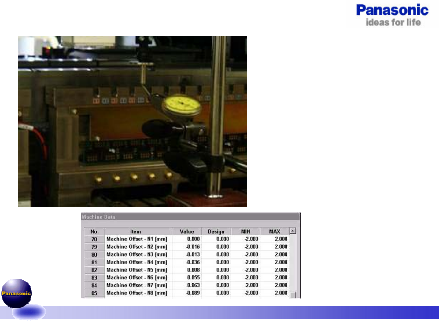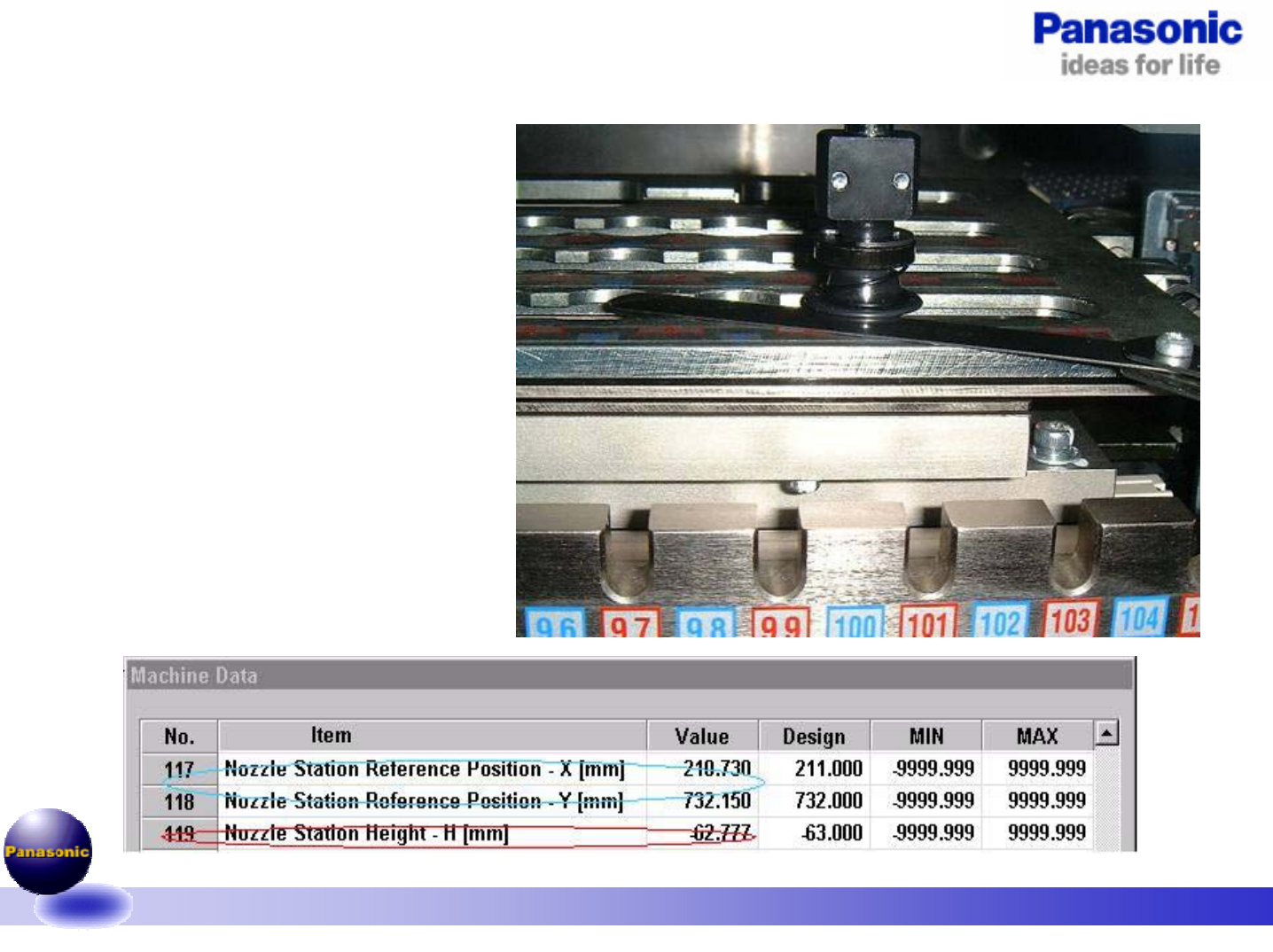 1.1-050805 32/49 十七、吸着原点位置确认。 1. 将吸着高度治具置于 ZNo.43 ,将 NOZZLE 治具置于 HEAD1 2. 使用 NC JOG 方法,下降 HEAD1 (将 NOZZLE 治具插入吸着高度治具) 3. 确认 X/Y 的偏差,将偏差值登入 Machine Data ( No.1~No.2 machine offset-x/y ) 4. 重复步骤 2 、 3 ,直至能顺畅的插入
