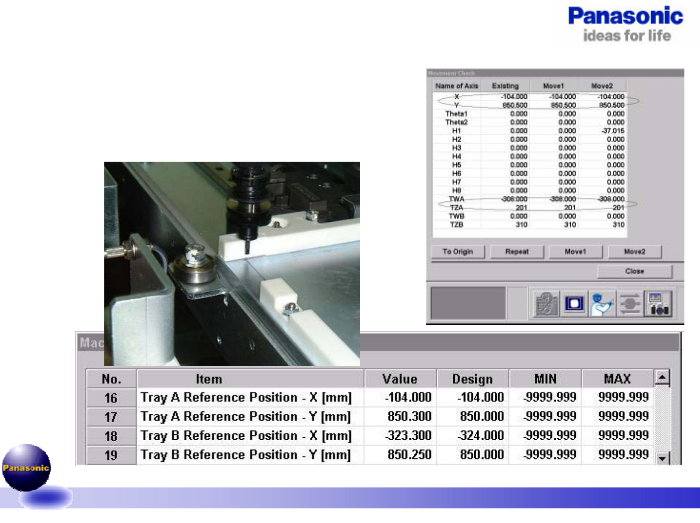 1.1-050805 36/49 二十一、托盘吸着高度调整。 1. 将 NOZZLE M 装于 HEAD1 ,在 NC MOVE 中输入 TZA:201;TWA:-308 2. 拉出托盘后,将 HEAD1 移至托盘上 3. 将 HEAD1 下降,测量 NOZZLE 与托盘的间隙;规格值: -63 ± 0.5mm 4. 若不良,修改 MACHINE DATA ;重复 3 步