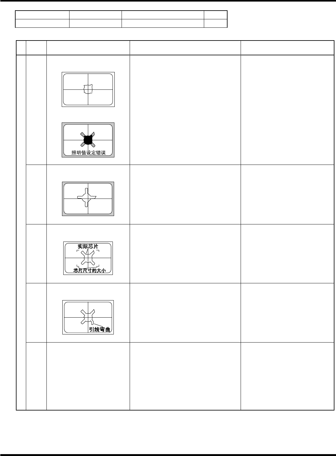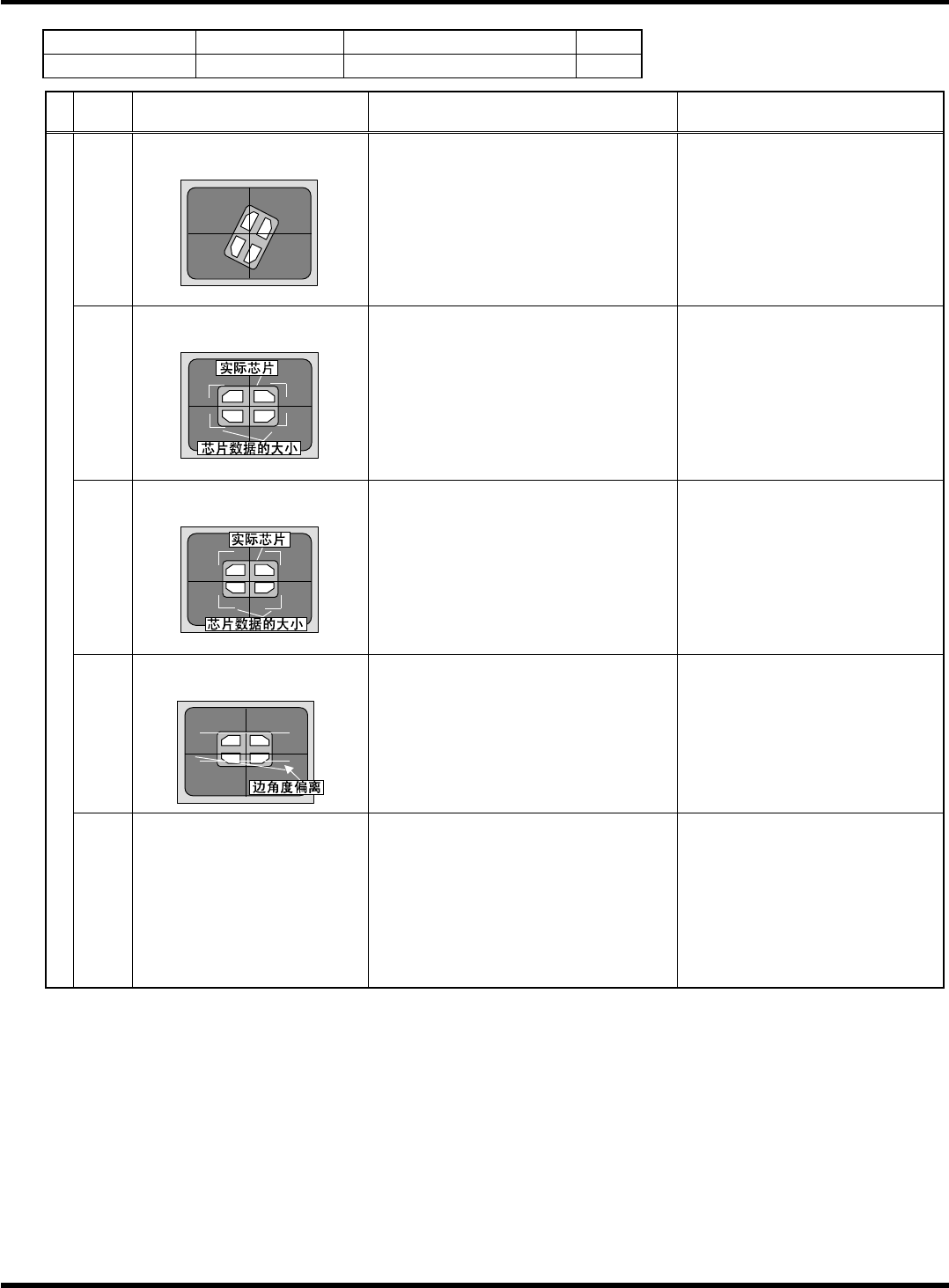 HGR14 附录 1.4 轮廓识别错误信息 附录 1-100 参考 No. 形状编号 类别 81 5k 过滤器 、 HIC 等 1/1 代码 内容 原因 对策 1) 部品的角部不是锐角 请确认对象部品。 20 (20) 部品角部位置检测异常 < 错误画面 > 21 (15) 识别角度异常 < 错误画面 > 1) 识别角度超出容许范围 ± 30 ° 以上 请确认部品高度、 吸着位置、 吸着 偏移量、 使用吸嘴, 使…