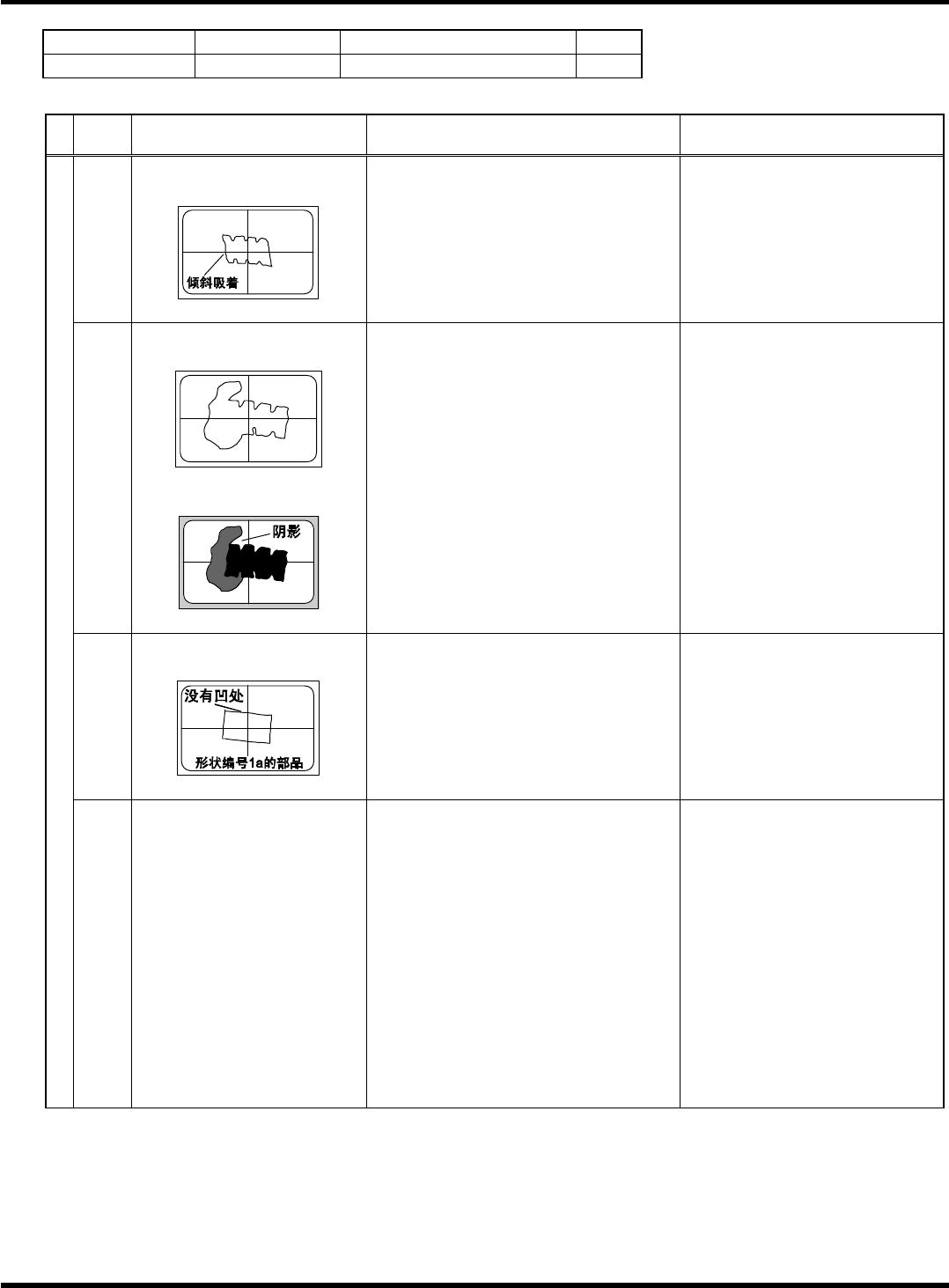 HGR14 附录 1.4 轮廓识别错误信息 附录 1-110 参考 No. 形状编号 类别 15 6 1i 壳、透明树脂部品 等 1/1 代码 内容 原因 对策 1) 识别角度超出容许范围 ± 30 ° 以上 请确认部品高度、 吸着位置、 吸着 偏移量、 使用吸嘴, 使吸着 状态 更 趋稳定。 21 (15) 识别角度异常 < 错误画面 > 请确认式样角度。 ( 配置数据 ) 1) L 设定错误 请正确设定 L 。 ( 芯片…