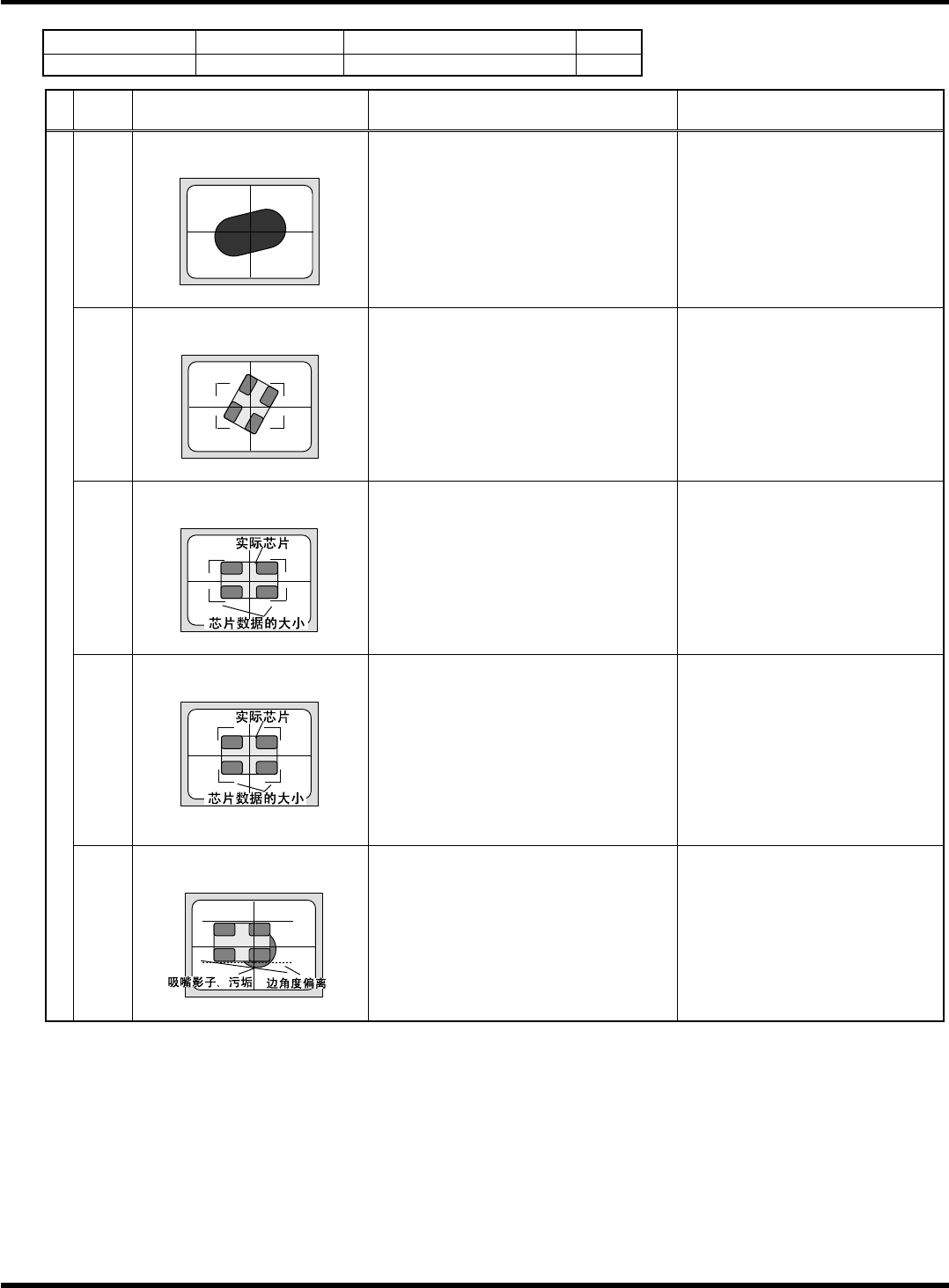 HGR14 附录 1.4 轮廓识别错误信息 附录 1-112 参考 No. 形状编号 类别 16 0 5h 壳、插入连接器 ( 外形 ) 等 1/1 代码 内容 原因 对策 1) 吸着错误、吸着异常 ( 错误画面上只看见吸嘴的轮廓 ) 请确认部品高度、 吸着位置、 吸着 偏移量、 使用吸嘴, 使吸着 状态 更 趋稳定。 20 特征点数在规定外 < 错误画面 > < 推断图像 > 2) 参考编号错误 [ 规定值 ]…
