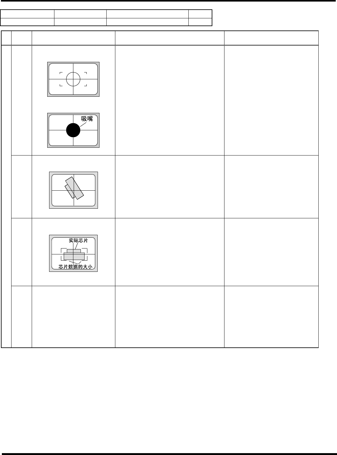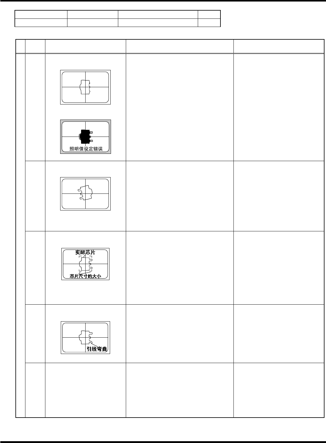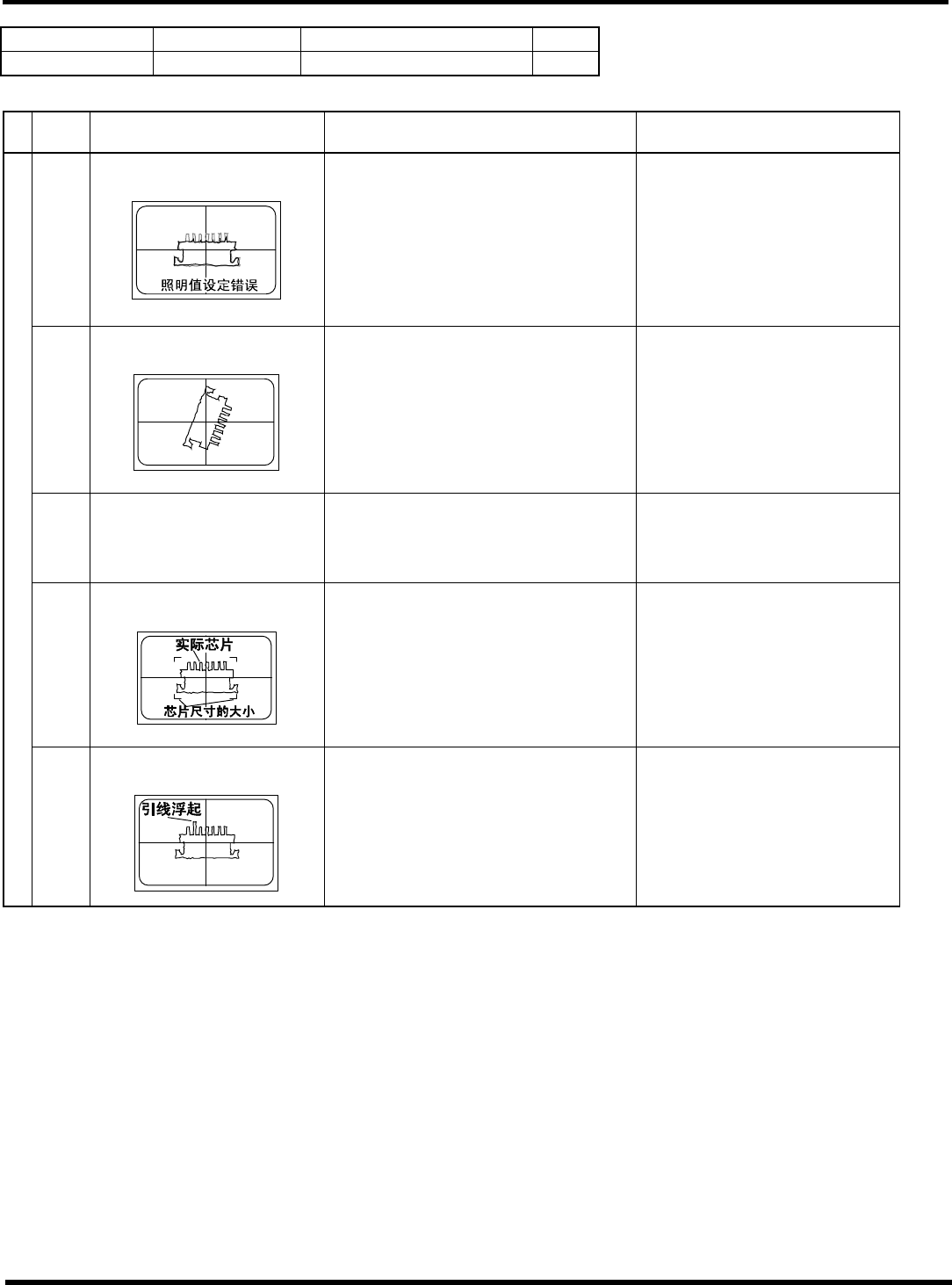HGR14 附录 1.4 轮廓识别错误信息 附录 1-1 13 参考 No. 形状编号 类别 16 1 ~ 1 65 3b, 3c N-Tr 等 1/1 ∗ 以下图的式样为 0 ° 。 代码 内容 原因 对策 1) 吸着错误、吸着异常 ( 错误画面上只看见吸嘴的轮廓 ) 请确认吸着状态。 ( 确认芯片数据及高度检测系统 ) 2) 参考编号错误 请确认芯片数据的参考编号。 ( 芯片数据 ) 20 (20) 特征点数在规定外 < 错…