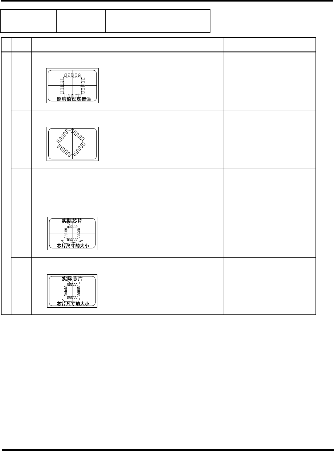 HGR14 附录 1.4 轮廓识别错误信息 附录 1-1 15 参考 No. 形状编号 类别 17 1 ~ 1 92, 196 4a 连接器、 IrDA 等 2/2 ∗ 以下图的式样为 − 90 ° 。 代码 内容 原因 对策 1) 部品异常 ( 引线弯曲等 ) 请检查部品的包装状态。 2) 芯片数据设定错误 请正确设定芯片数据。 3) 吸嘴的污垢 ( 只限 CM95R -M/L) 请清扫吸嘴。 4) 反射镜的污垢 ( 只限 CM95…