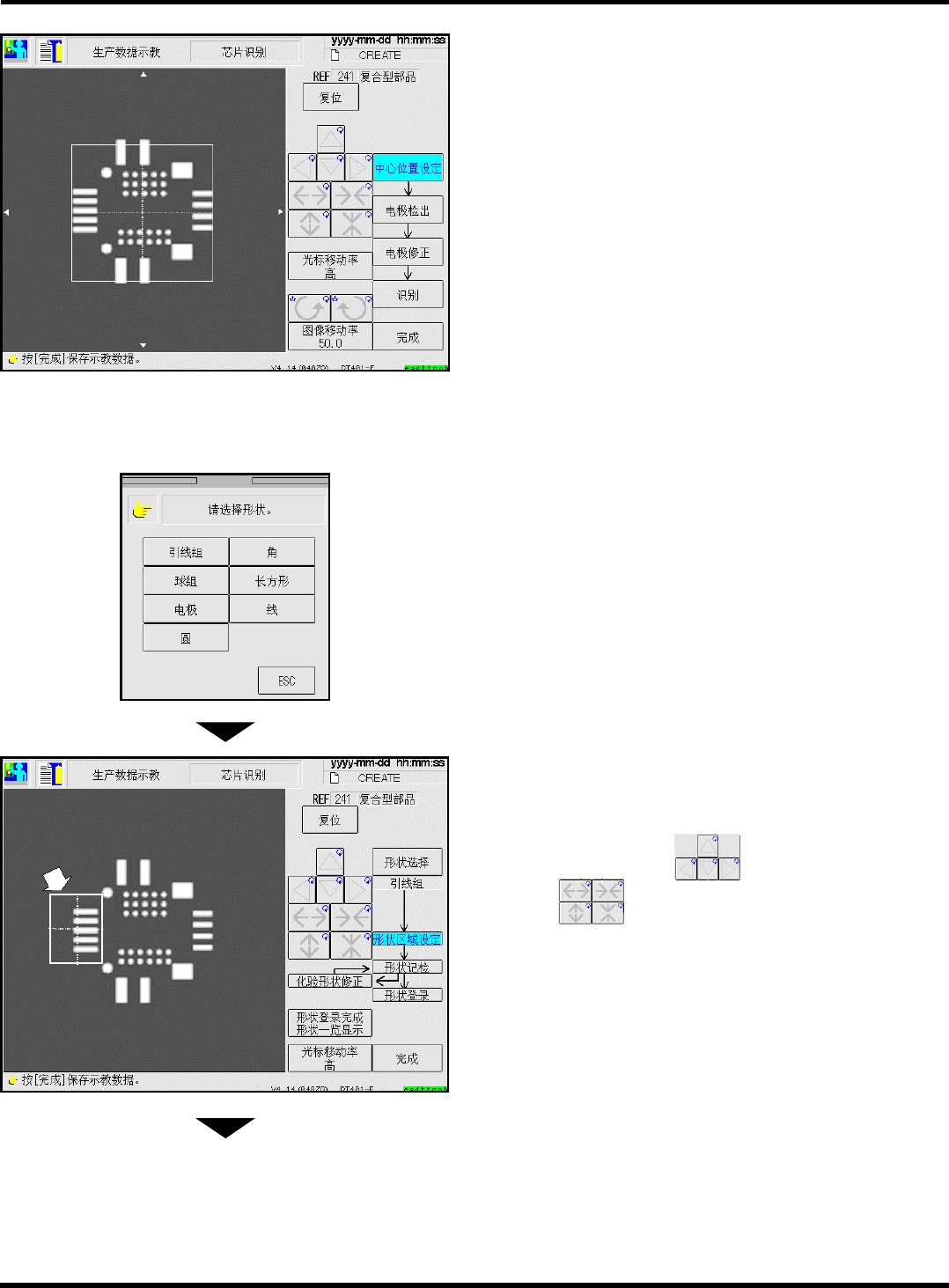 HGR14 附录 1.3 按形状输入数据项目 附录 1-7 0 • 在画面中央部将会显示补正完了的元件图像 X/Y/ θ 。 ∗ 平时在此不必移动、转动图像或框子。但是部 品不在画面中央 或倾斜到 θ 方向时, 请进行 BOX 框位置、尺寸、图像 X/Y/ θ 的微调整。 另外,在此设定的 BOX 框中心位置 (BOX 内虚 线的交点 ) 将成为识别中心位置。因为部品吸着 面状态等的原因, 若要故意地将 识别中心设定在 别的位置,请…