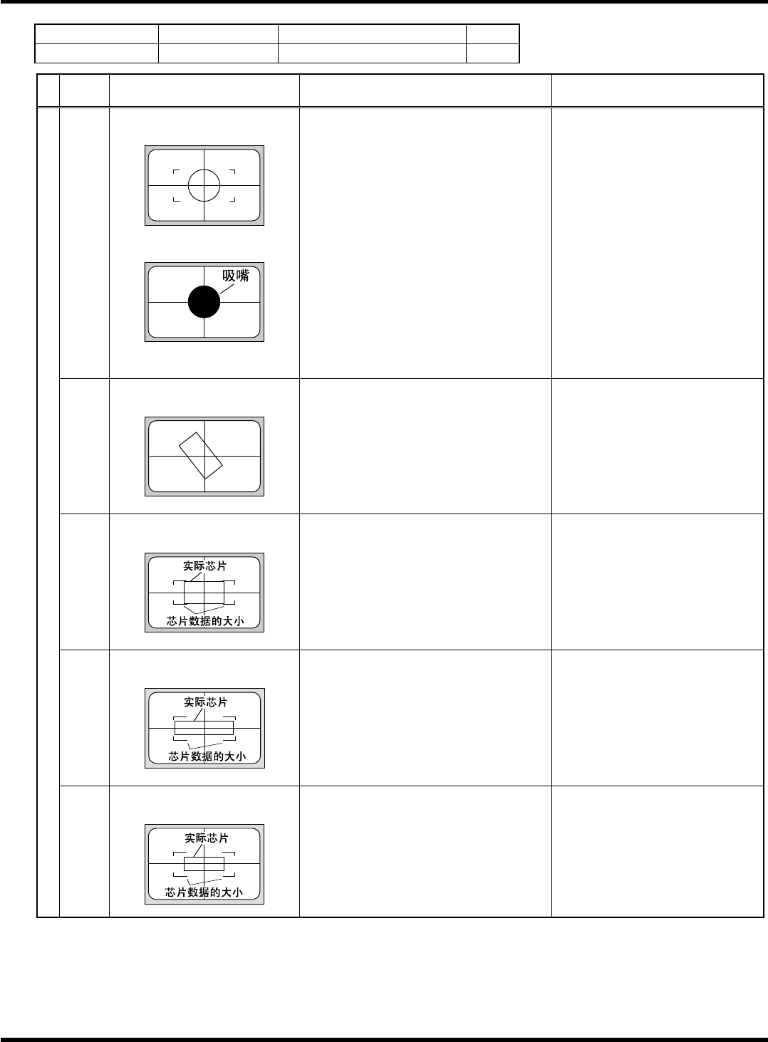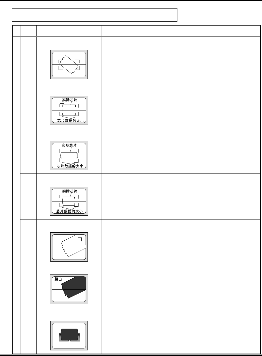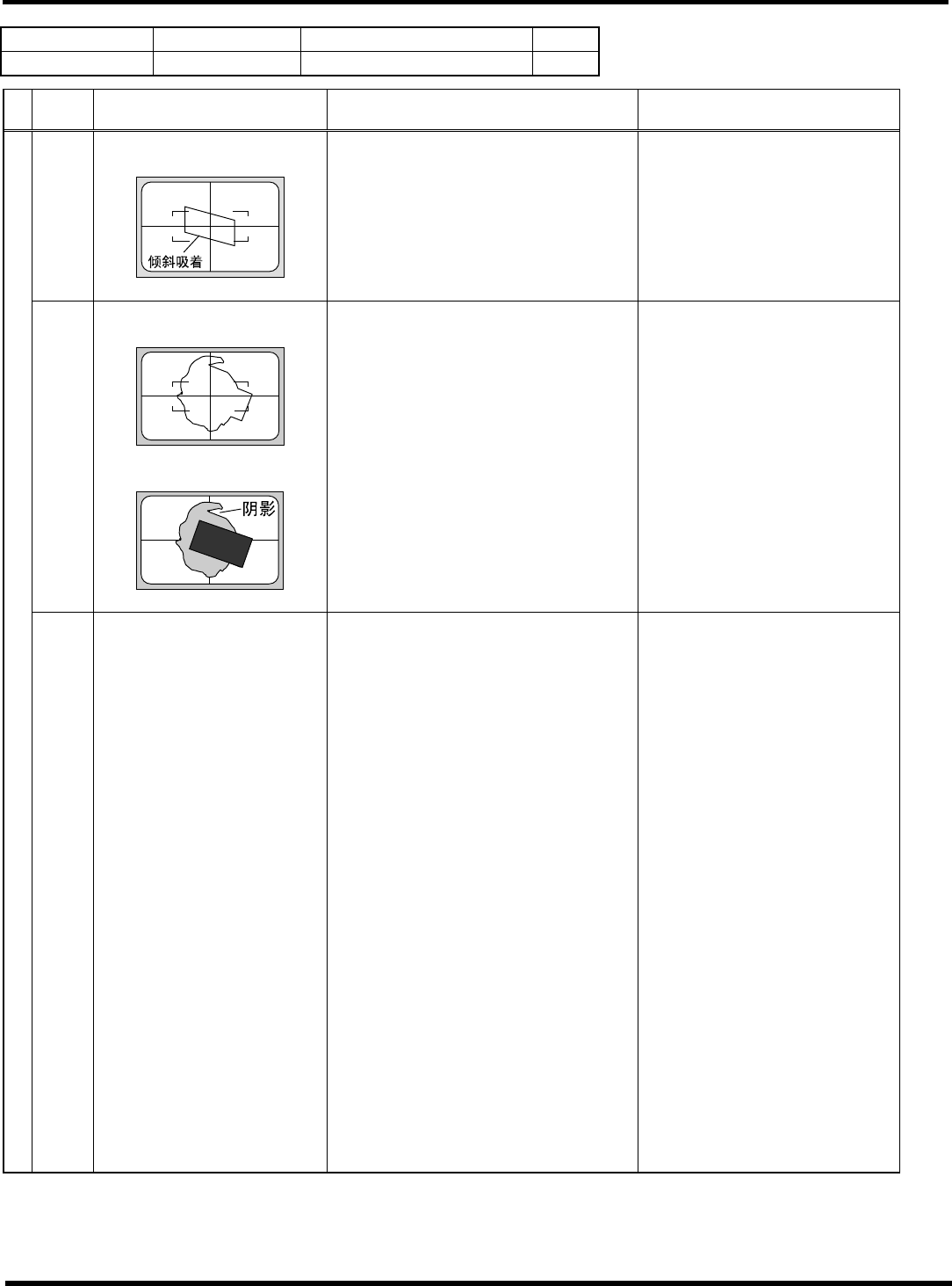 HGR14 附录 1.4 轮廓识别错误信息 附录 1-88 参考 No. 形状编号 类别 51 ~ 56, 8 8, 89 , 157 1a , 1 d 固定电阻、电容器 等 2/2 代码 内容 原因 对策 1) L 或者 W 设定错误 请正确设定 L 或 W 。 ( 芯片数据 ) 2) 吸着错误·吸着异常 请确认部 品高度 、 吸着位置、 吸着 偏移量、 使用吸嘴, 使吸着状 态更 趋稳定。 41 (10-11) 直交度异常 <…
