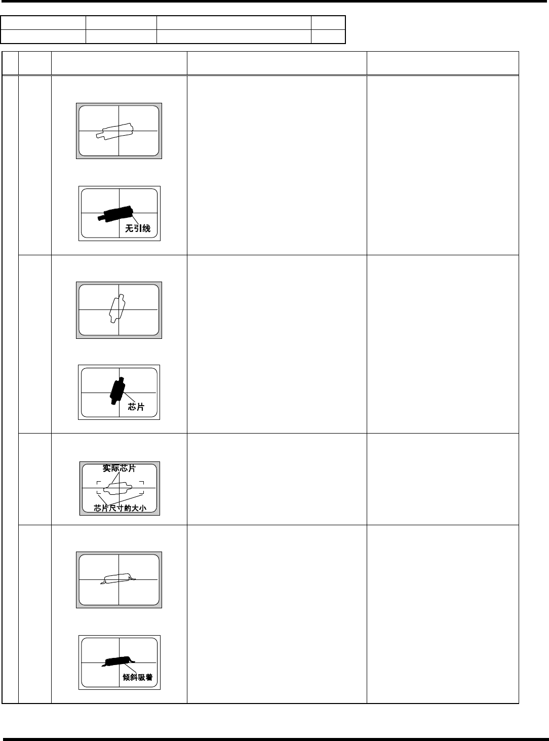 HGR14 附录 1.4 轮廓识别错误信息 附录 1-96 参考 No. 形状编号 类别 75 ~ 76, 8 2, 95, 15 2 2a S 微型 Di 、微型 Di 等 1/1 代码 内容 原因 对策 1) 吸着错误、吸着异常 ( 错误画面上只看见吸嘴的轮廓 ) 请确认吸着状态。 ( 确认芯片数据、高度检测系统 ) 2) 参考编号错误 请确认芯片数据的参考编号。 ( 芯片数据 ) 3) 部品异常 ( 引线弯曲等 ) 请检查部品的包…