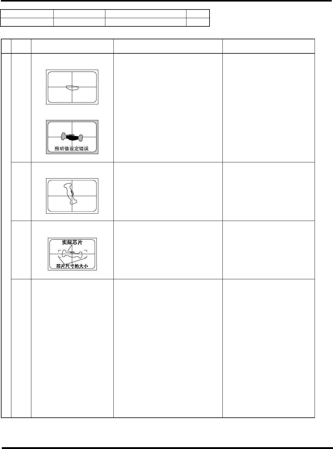 HGR14 附录 1.4 轮廓识别错误信息 附录 1-98 参考 No. 形状编号 类别 77 ~ 79 5a 玻璃管二极管 等 1/1 ∗ 以下图的式样为 ± 90 ° 。 代码 内容 原因 对策 1) 吸着错误、吸着异常 ( 错误画面上只看见吸嘴的轮廓 ) 请确认吸着状态。 ( 确认芯片数据、高度检测系统 ) 2) 参考编号错误 请确认芯片数据的参考编号。 ( 芯片数据 ) 20 (20) 特征点数在规定外 < 错误图像 &…