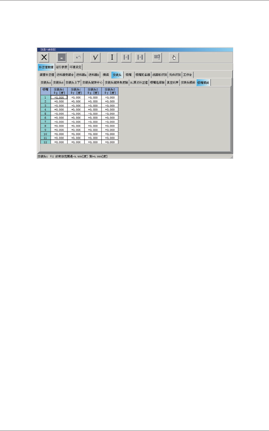 在“补正值数据”选项卡中,按 [ 安装头 ]Tab,再按 [ 吸嘴倾斜 ]Tab,