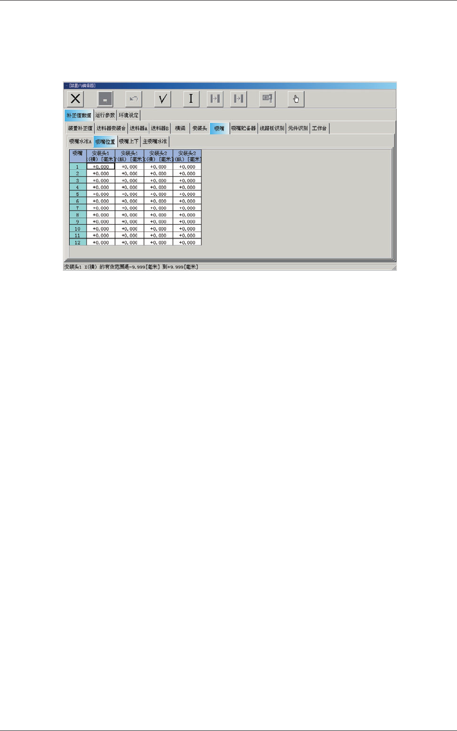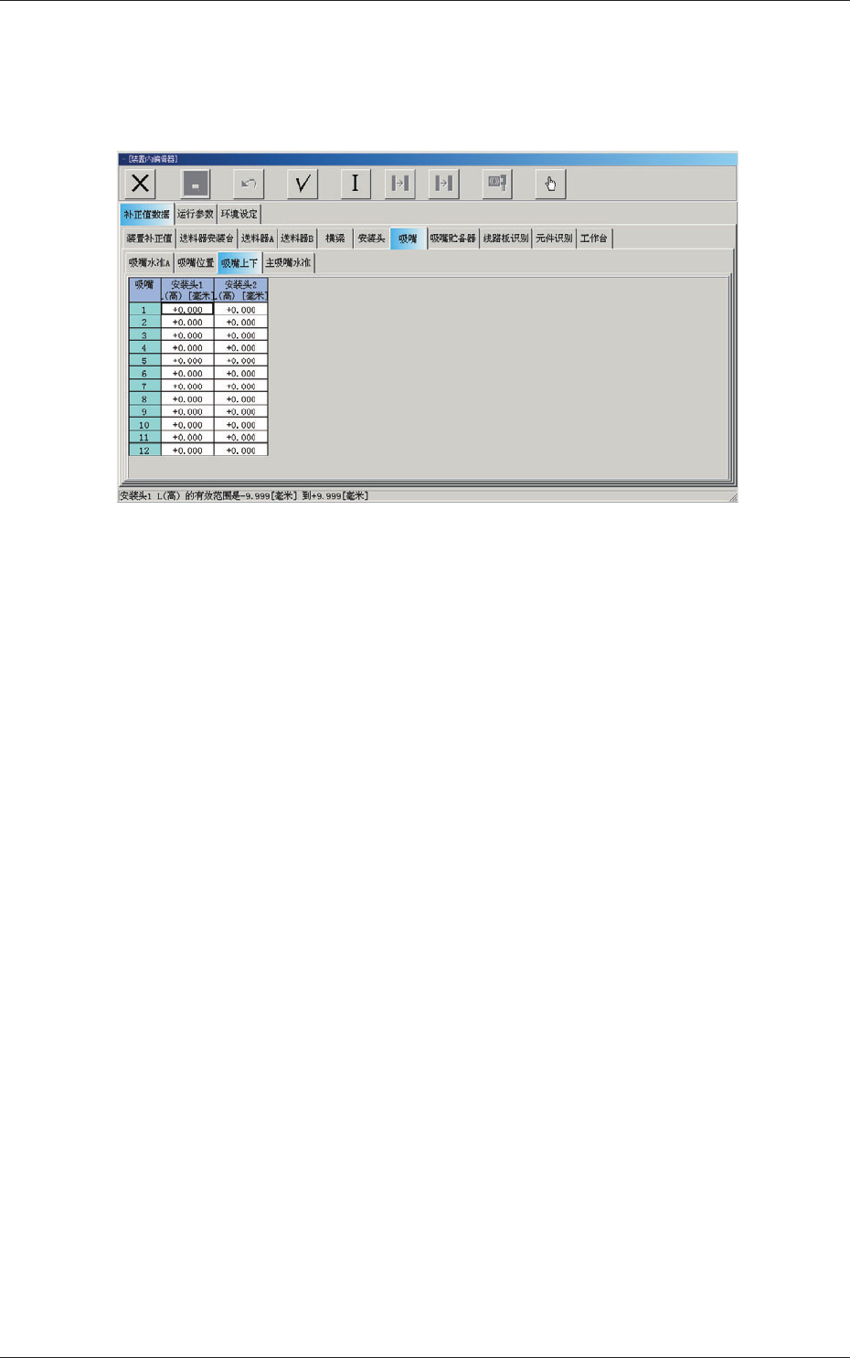 调整安装头旋转中心与各吸嘴前端位置对设计值的偏离量。