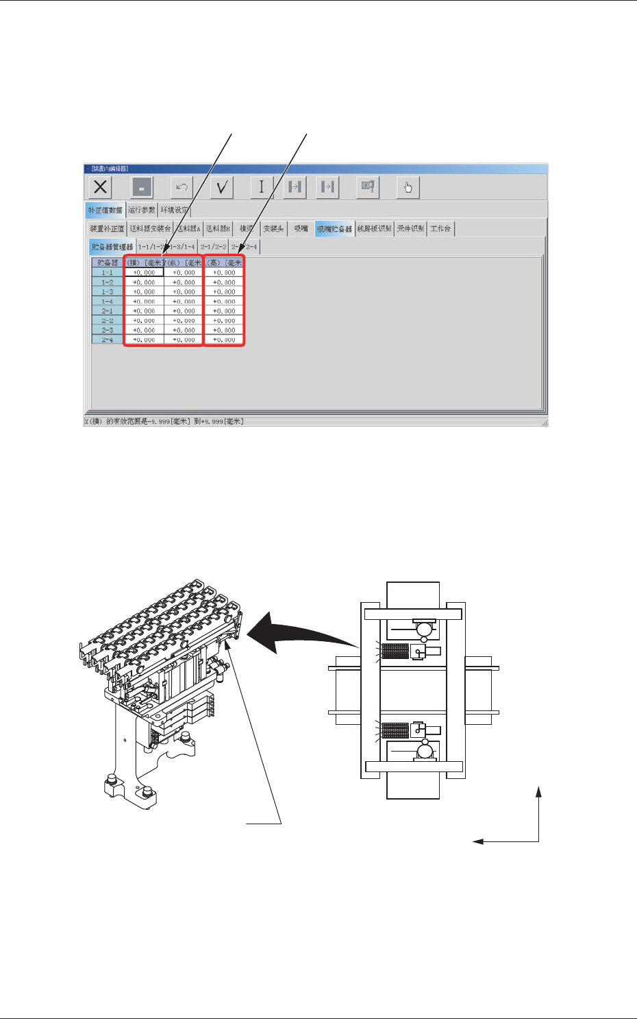 6 - 40 0606 - 001 2.1 补正值数据 [1] X( 横 )、Y( 纵 )[毫米] 是调整从线路板定位基准 XY 坐标 ( 装置基准 XY 坐标:原点 P 0 ) 看 到的吸嘴贮备器 ( 储料器 ) 单元位置对设计尺寸的位置偏离的补 正值,设定装置基准 XL 坐标系为基准。 [2] L( 高 )[ 毫米 ] 设定补正值为“ + ”值, 吸嘴交换位置 ( 高度 ) 变为 L( + ) 方向 ( 增 加下降冲程量的方向 )。…