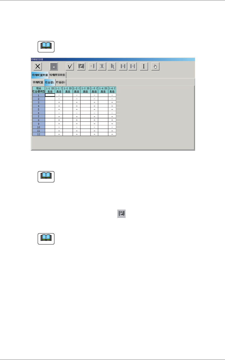 6 - 72 0606 - 001 3.1 吸嘴配置数据 3.1.2 贮备器 ( 储料器 )1 ~贮备器 ( 储料器 )2 在“吸嘴配置数据”选项卡中,按 [ 贮备器 ( 储料器 )1]Tab,显示以 下界面。 Note [ 贮备器 ( 储料器 )2] 也显示同样的界面。 Fig. 3F61 “贮备器 ( 储料器 )1”选项卡 Note 配置有中异形 ( 选项 ) 时,显示为中异形的吸嘴储料器数也是 8。 1-1 ~ 1-4 ID、2-…