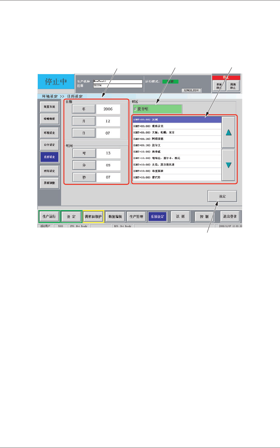 6 - 90 0612 - 002 6. 日历设定 6. 日历设定 按“系统设定”菜单栏的 [ 日历设定 ] 按钮,显示“日历设定”界面。 可以设定装置的系统时间 ( 年、月、日、时、分、秒 ) 及时区。 [1] [2] [4] [3] Fig.3F80 “日历设定”界面 [1] [ 编辑 ] 按钮 每个年、月、日、时、分、秒、都设置有显示输入界面的按钮。 [2] 夏令时指定 夏令时的情况进行选定 ( 按单选框、将  设为  )。 …