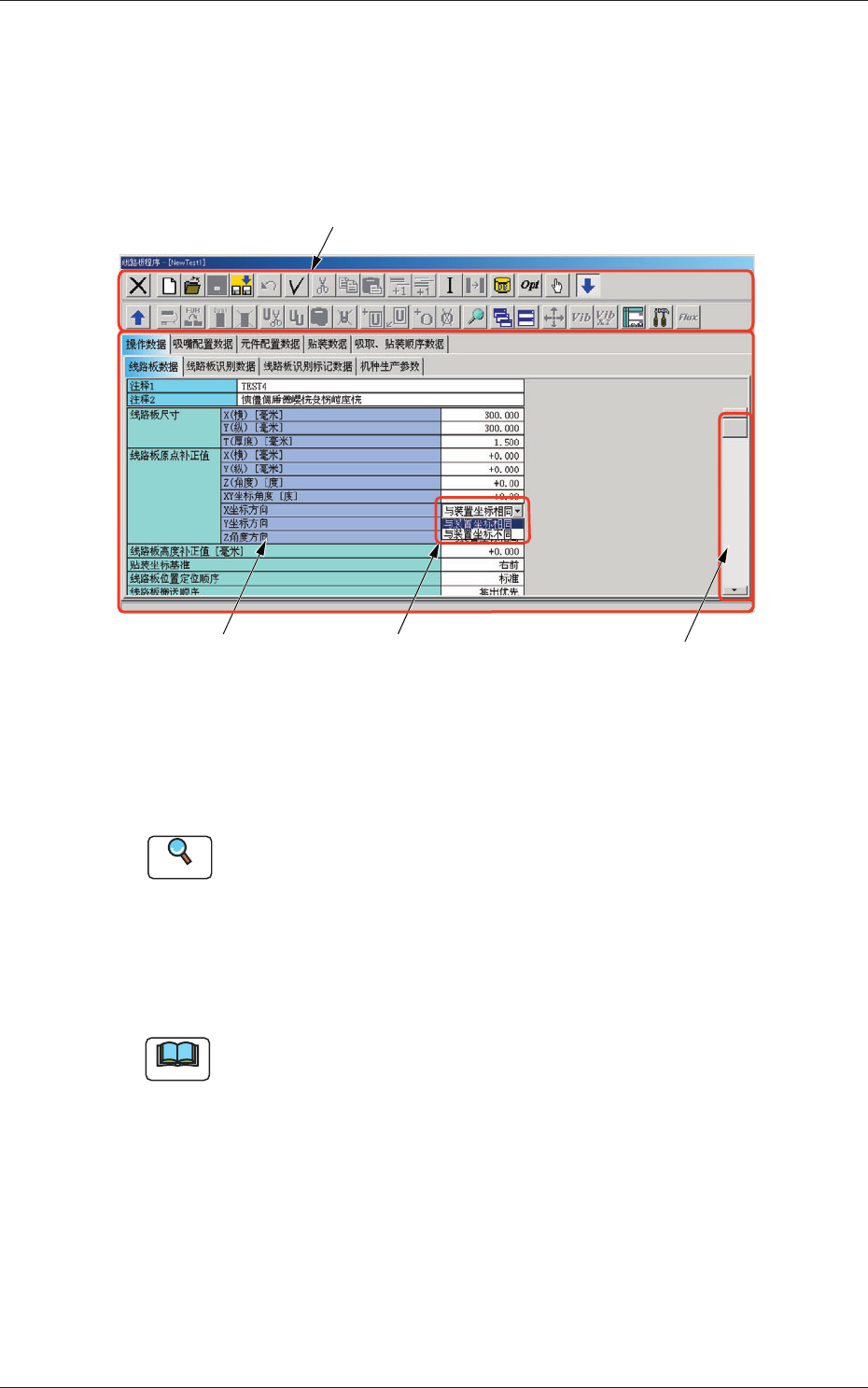 2 - 1 0606 - 001 1. 界面的构成和图标的说明 1.1 界面的构成 说明数据编辑界面的构成。 Fig.3B1 “线路板程序”编辑界面示例 [1] 工具栏 显示在数据编辑界面中可执行的操作指令的图标。 Reference 有关图标的说明请参照“1.2 基本图标的说明”章节。 [2] 编辑页面 为编辑数据的页面。 可自由更改页面的大小和位置。 Note 选择图标选项后按跟踪球的右键,打开快捷菜单。 1. 界面的构成和图标的说…
