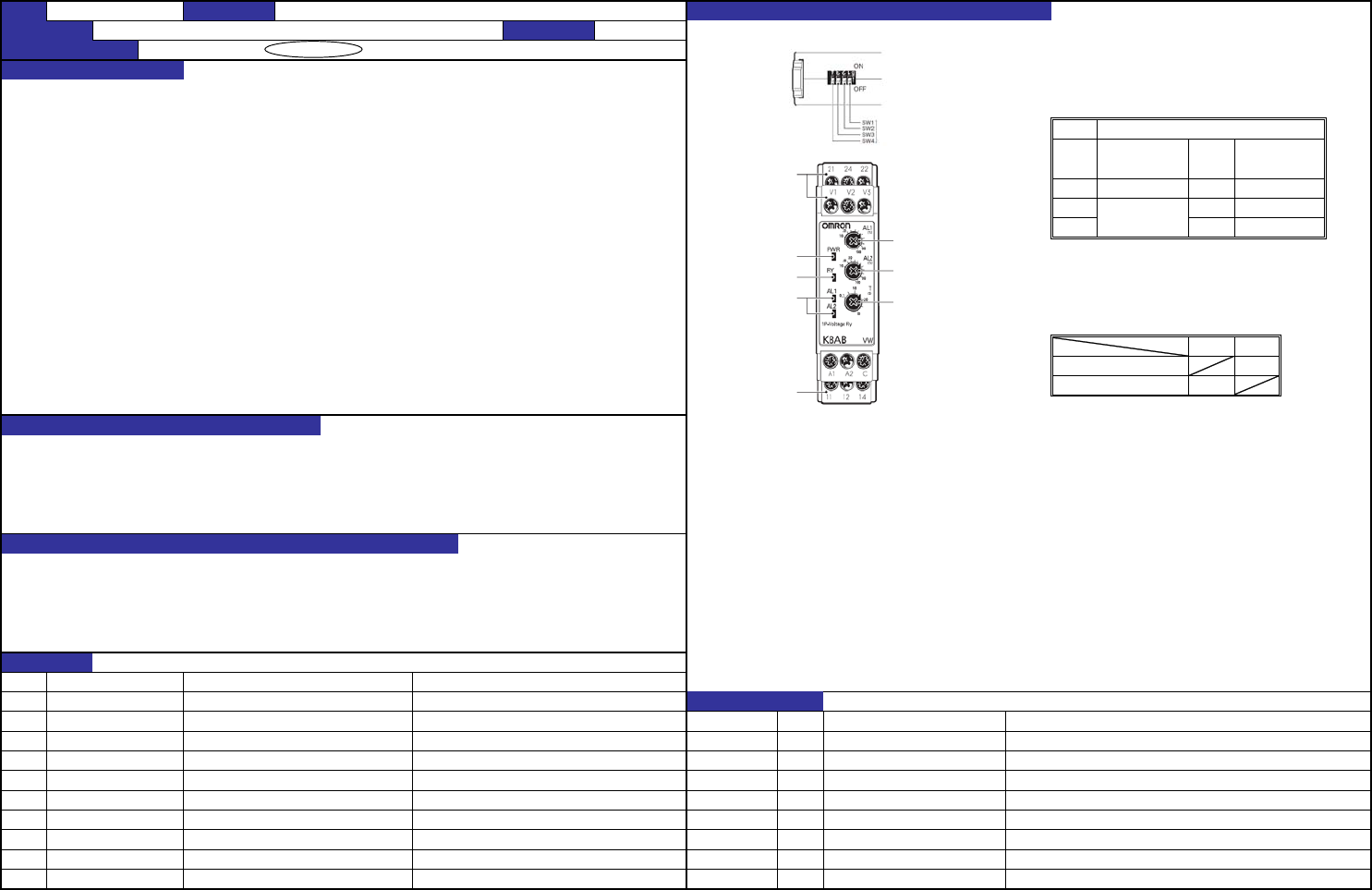 QA表 NO. 13 (1/2) NO. 13 (2/2) 机种 1. 变暗开关的设置 通过主机下面的变暗开关请把电源接通时锁定时间、 返回方式、接点驱动方式、运动模式的切换按下表进行设置。 变暗开关的设定 电源接通时锁定时间切换(SW1) :关(1秒) 返回方式切换(SW2) :开(自动返回) 接点驱动方式(SW3) :关(正常打开) 动作模式切换(SW4) :开(不足电压) 电压整定 2. 整定方式 电压整定旋钮(SV) :50﹪(…