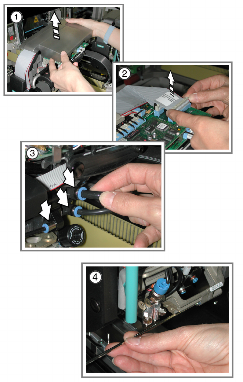 ④헤드 앞 부분의 4 개의 나사를 풀고 (3mm 소켓 헤드 스패너 사용 ) 앞부분을 제거합니다 .