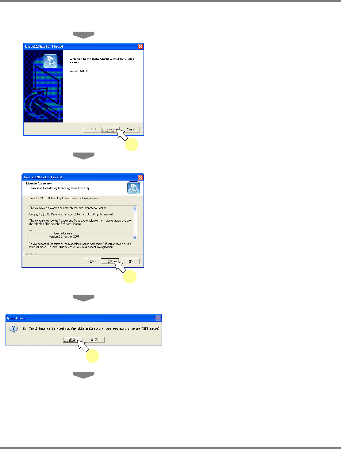 NPM / AM LNB 2.7 品质信息数据库的安装 Page 2-86 EJM5DC-MB-02L-0 3 完成了 C 运行程序的安装后,将会显示 品质信 息查看器的安装画面。 6 点击 [Next] 。 将显示许可证使用承诺画面。 7 确认内容后,点击 [Yes] 。 如果 PC 内没有安装 JAVA2 Runtime ,将会显 示 JAVA2 Runtime 的安装确认画面。 8 点击 [ 是 ] 。 将显示许可…
