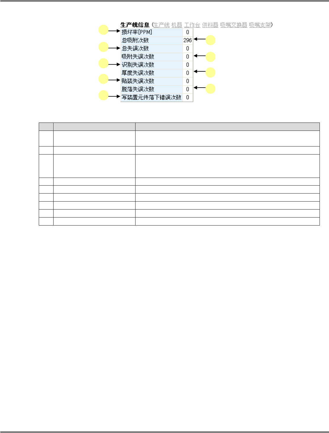 NPM / AM LNB 3.1 生产管理信息 EJM5DC-MB-03L-0 4 Page 3-9 E) 生产线信息 名称 说明 a 损坏率 [PPM] 用以下的算式计算损坏率。 总失误次数 / 总吸着次数 1000000 b 总吸附次数 这个生产线的总吸附次数。 c 总失误次数 这个生产线的总失误次数。 总失误次数是指吸附失误、识别失误 、厚度失误、贴装失误、脱落 失误、写装置元件落下失误的合计次 数。 d 吸附失误次数 这…