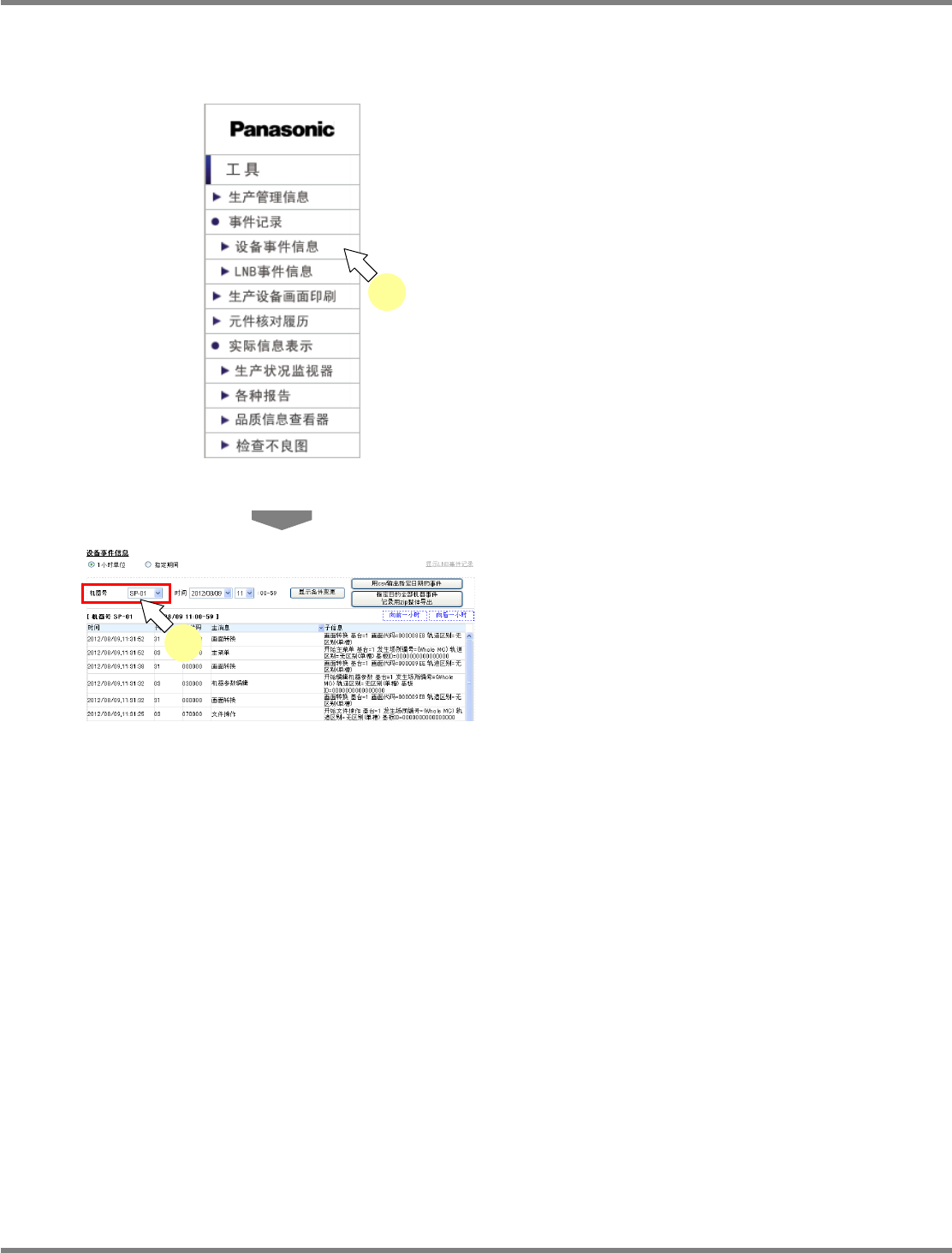 NPM / AM LNB 3.2 事件信息 EJM5DC-MB-03L-0 4 Page 3-31 3.2.3 SP 事件信息 可通过 LNB 确认在 SP 设备上发生事件。 1 从菜单中选择 ‘ 事件记录 ’ 的 ‘ 设备事件 信息 ’ 。 将显示 < 设备事件信息 > 画面。 2 从生产机器号的组合框中选择以 ‘SP’ 开始的机器号。 显示 SP 用的设备事件。 SP 用的设备事件可与 本体设备同样显示并执行 C…