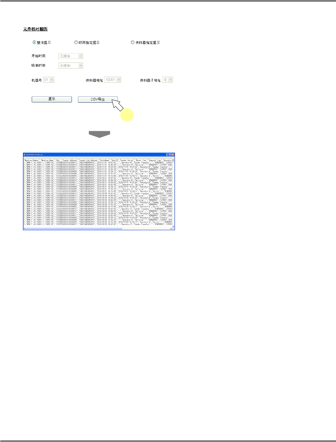 NPM / AM LNB 3.4 元件核对履历 EJM5DC-MB-03L-0 4 Page 3-37 3.4.3 元件核对履历 CSV 导出 1 在元件核对履历画面上,点击 [CSV 导 出 ] 。 将按照在显示方法所指定的条件而 以 CSV 形式 导出。 将会显示 Internet Explorer 的文件保存画面, 请对文件命名后保存。 2 以文本编辑程序等任意应用软件打开 所保存的文件。 关于表中所显示各项目的详细说…