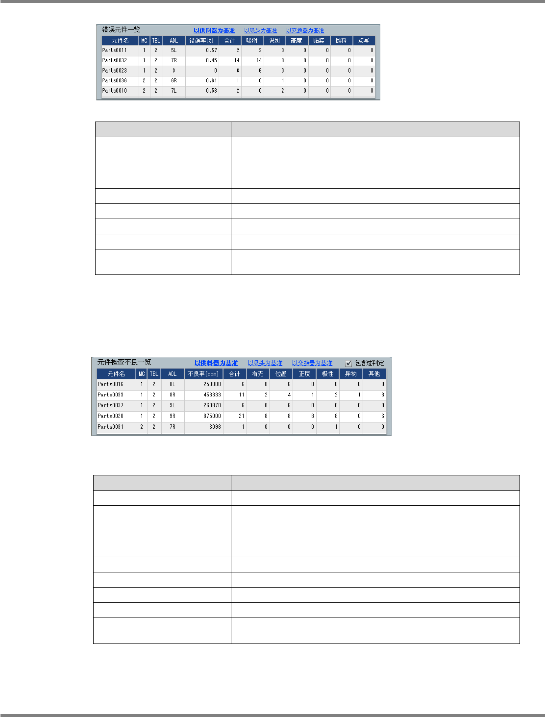 NPM / AM LNB 3.5 实际信息表示 EJM5DC-MB-03L-0 4 Page 3-75 错误元件一览表的显示项目 项目 说明 以供料器为基准、 以吸头为基 准、以交换器为基准 单击各个文字,即能够切换到相应的 各个显示形式。在初期启动 之际, 为 选择了 ‘ 以供料器为基准 ’ 的状态。 处于被选择状态的项目, 以黑体显示。在这里所变更的显示形 式,还会反应进检查不良元 件一览表。 元件名 属于错误统计对象的元件…