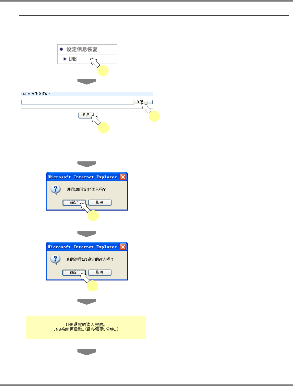 NPM / AM LNB 4.6 设定信息恢复 EJM5DC-MB-04L-0 4 Page 4-39 4.6 设定信息恢复 进行 LNB 设定信息的读入。 指定所备份的 LNB 设定信息,即可反映该设定。 1 在菜单中选择 ‘ 设定信息恢复 ’ 的 ‘LNB’ 。 显示出 <LNB 设定信息恢复 > 画面。 2 点击 [ 浏览 ] , 指定 LNB 设定信息的所在 地点。 将会打开指定设定信息文件的对话框 ,请指定…