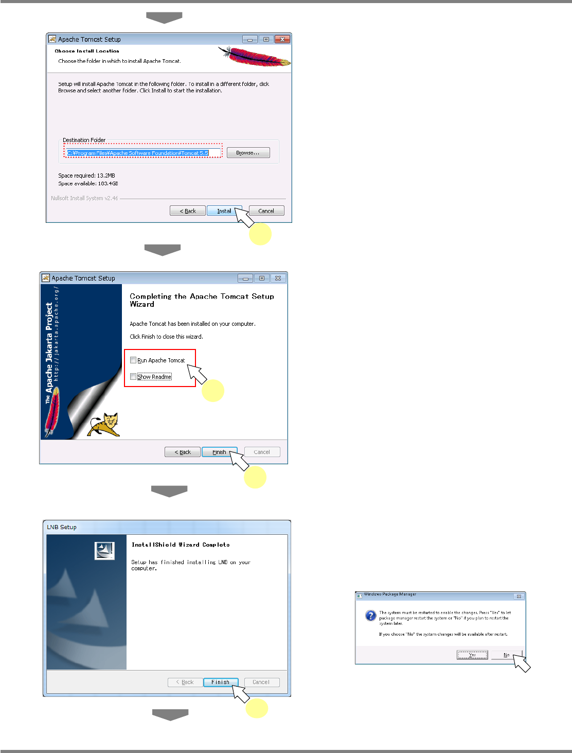 NPM / AM LNB 2.5 品质信息数据库的安装 Page 2-18 EJM5DC-MB-02L-0 3 11 输入 Tomcat 用户信息后, 点击 [Next] 。 Tomcat 用户信息,请如下输入。 User Name : admin Password : pfsc 12 确认 Java1.5.0_22 的安装文件夹是否 被指定,点击 [Next] 。 当在 Java 安装文件夹内显示以下以外的 文件 夹名时, 请…